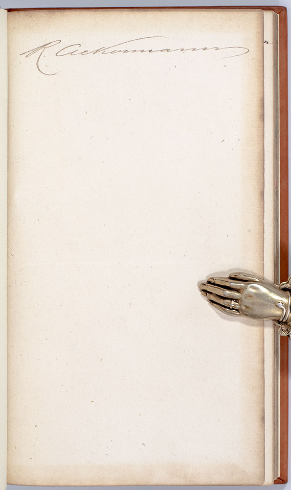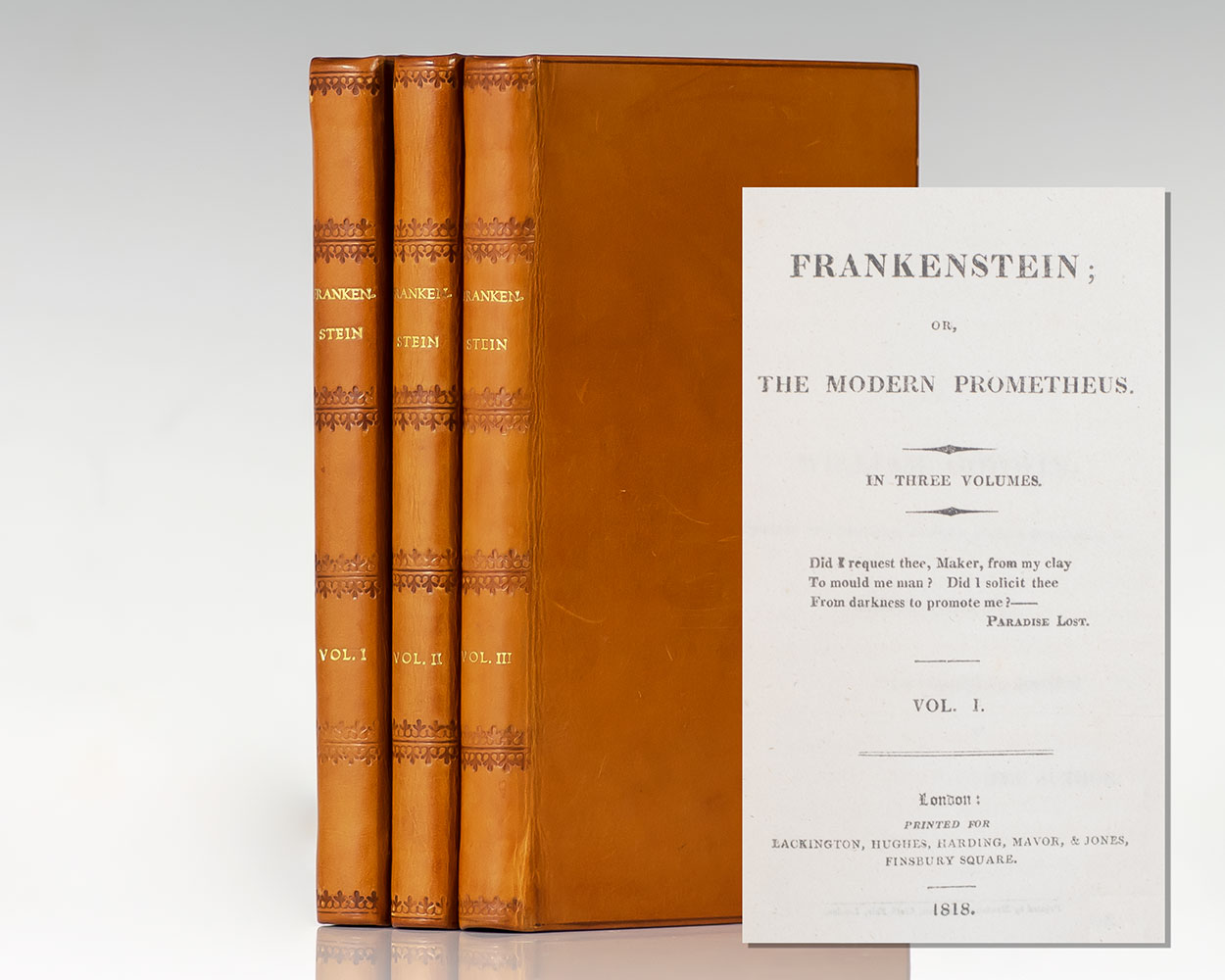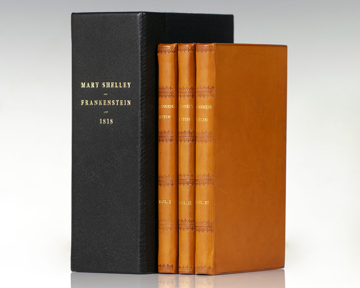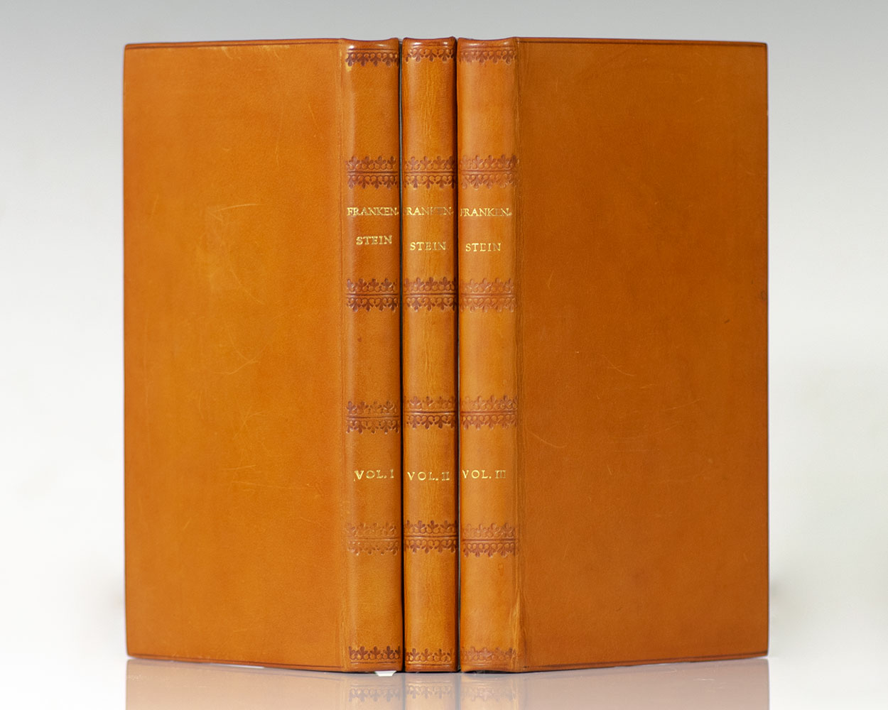 First edition of Mary Shelley's masterpiece and "the most famous English horror novel" (Clute and Nicholls); one of only 500 copies printed. Octavo, three volumes bound in full polished calf with gilt titles and stamping to the spine, all edges marbled. Association copy, from the library of great London publishers Rudolph and Adolphus Ackermann with their ownership signatures to the third and fourth endpaper each volume, "R. Ackermann" and "Adolphus Ackermann 1827." Rudolph Ackermann Sr. published Mary Shelley's story "Lacy De Vere" as an anonymous work in the 1827 edition of his literary annual, Forget Me Not. It was their first and only partnership (although Mary Shelley wrote to him once more a few years later pitching another contribution). With Adolphus Ackermann's ownership signature being dates 1827, this copy was likely given this copy of Frankenstein by his new author, or she may have given it directly to his teenage son, Adolphus who, at the time, was only slightly younger than Shelley. In near fine condition. Housed in a custom half morocco clamshell box. Without half-titles or advertisements. An exceptional example of this exceedingly rare cornerstone of English literature, with fine provenance and only a handful appearing at auction.