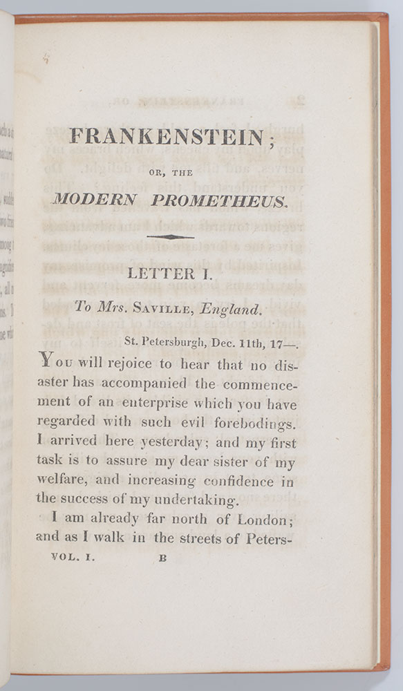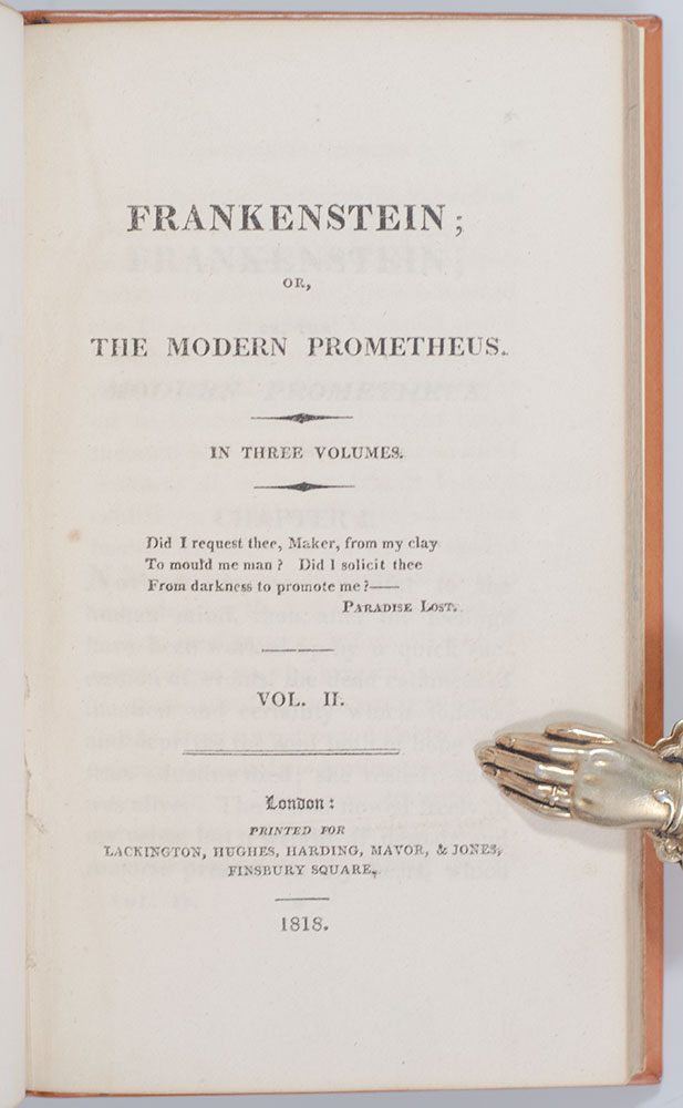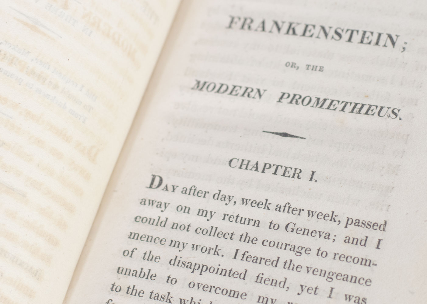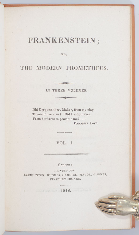 "the most famous English horror novel": Exceedingly rare first edition of Mary Shelley's masterpiece Frankenstein; one of only 500 copies printed and from the library of famed publishers Rudolph and Adolphus Ackermann