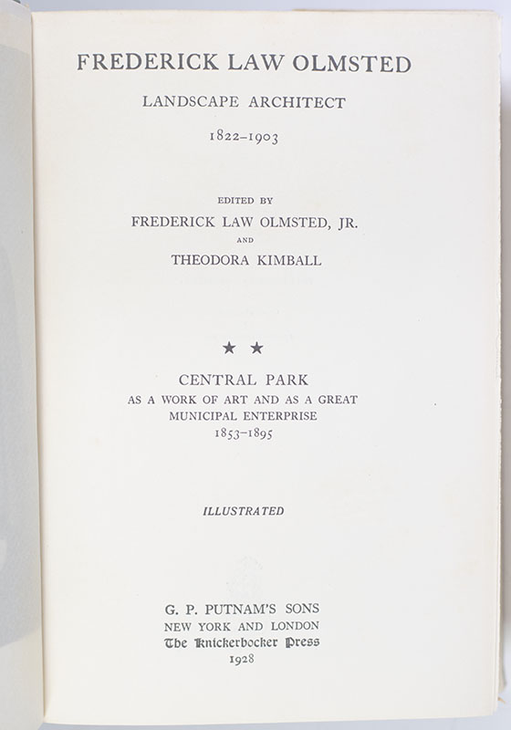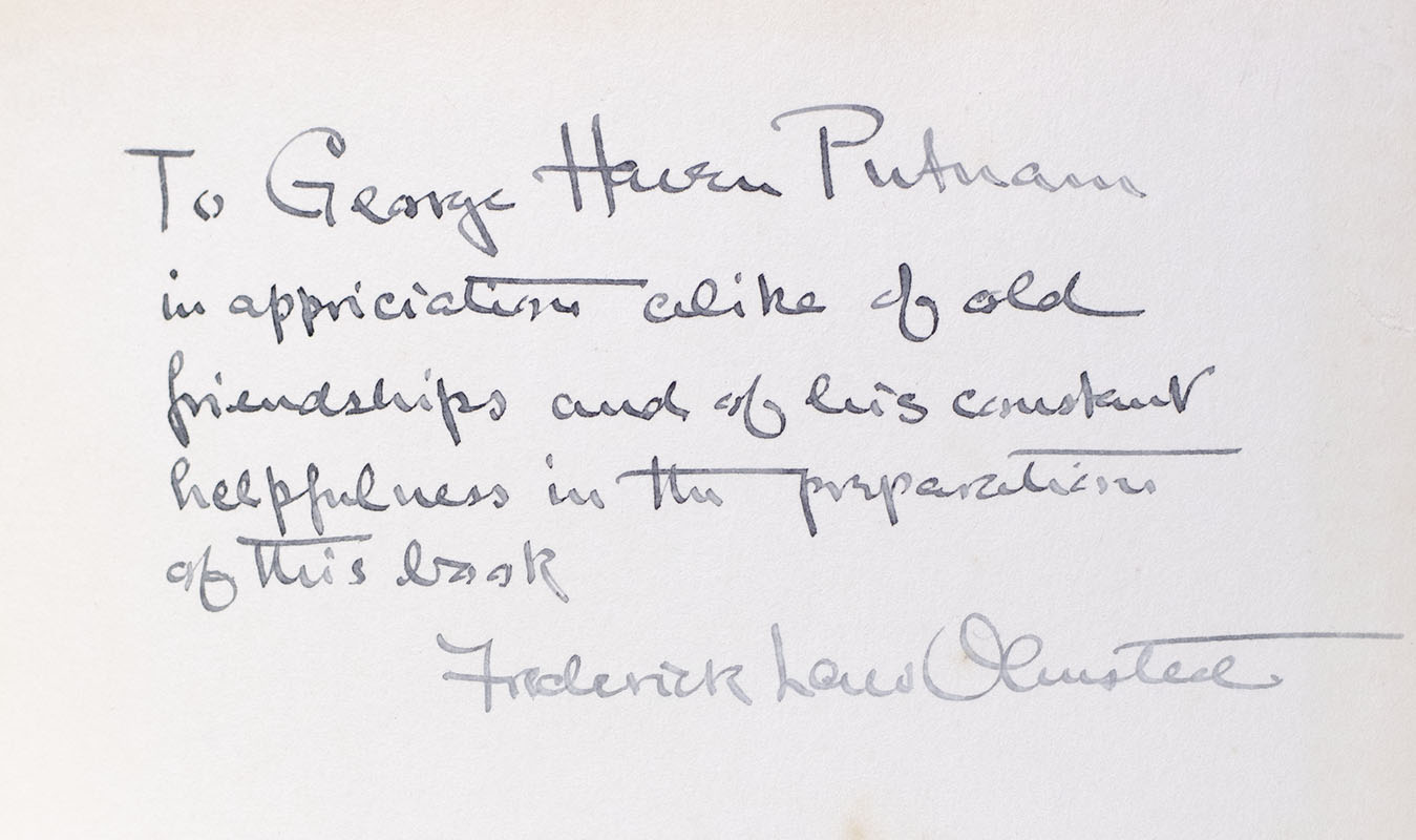 First edition of Frederick Law Olmsted: Landscape Architect 1822-1903; inscribed by Frederick Law Olmsted, Jr. to publisher George Haven Putnam