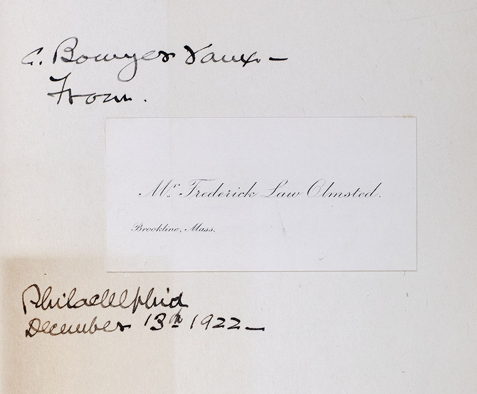 First edition of the first volume of the autobiography of one of the foremost figures in American landscape architecture, Frederick Law Olmsted. Octavo, original cloth, illustrated, tissue-guarded frontispiece portrait of Olmsted. Edited by Frederick Law Olmsted, Jr. and Theodora Kimball. Association copy, inscribed by Frederick Law Olmsted on the front free endpaper, “C. Bowyer Vaux from [printed calling card: Mr. Frederick Law Olmsted. Brookline, Mass.] Philadelphia. December 13th 1922.” The recipient, Calvert Bowyer Vaux was the son of English-American architect and landscape designer Calvert Vaux, who brought in the elder Olmsted (who had never before designed a landscape) to plan what was to be their most famed and celebrated effort, New York’s Central Park. Vaux, on his own and in various partnerships, designed and created dozens of parks across the northeastern United States, most famously in New York City, Brooklyn, and Buffalo. He introduced new ideas about the significance of public parks in America during a hectic time of urbanization. This industrialization of the cityscape inspired Vaux to focus on an integration of buildings, bridges, and other forms of architecture into their natural surroundings. In 1865, Vaux and Olmsted founded Olmsted, Vaux and Co., which went on to design Prospect Park and Fort Greene Park in Brooklyn, and Morningside Park in Manhattan. In Chicago, they planned one of the first suburbs, called the Riverside Improvement Company in 1868. The preface notes this volume’s commemoration of the centenary of Olmsted’s birth, describing his historic partnership with Vaux. Near fine in the scarce original dust jacket which is in very good condition. An exceptional association copy of this rare volume.