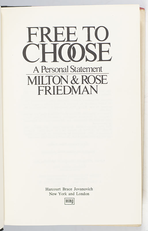 First edition, early printing of Friedmans' persuasive argument for the free market, based on the PBS series Free to Choose. Octavo, original half cloth. Presentation copy, inscribed by the author on the front free endpaper, "To Mary Strong, Milton Friedman." Near fine in a near fine dust jacket. Jacket design by Paul Gamarello.