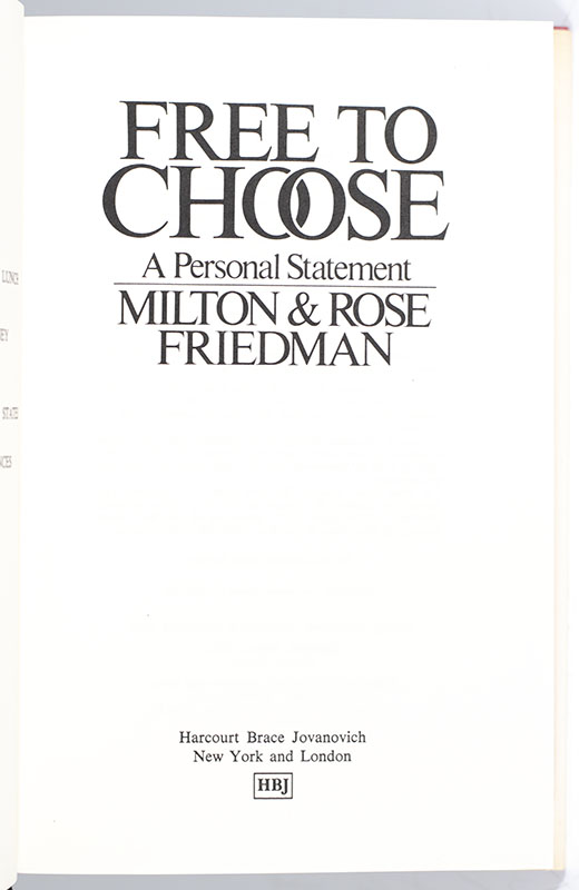 Early printing of Friedmans' persuasive argument for the free market, based on the PBS series Free to Choose. Octavo, original half cloth. Fine in a fine dust jacket. Jacket design by Paul Gamarello.