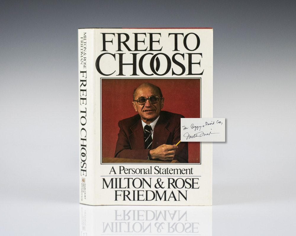 First edition, early printing of Friedmans' persuasive argument for the free market, based on the PBS series Free to Choose. Octavo, original half cloth. Presentation copy, inscribed by Milton Friedman on the half-title page to mathematician David Cox. Light rubbing, near fine in a near fine dust jacket. Jacket design by Paul Gamarello. A nice association.