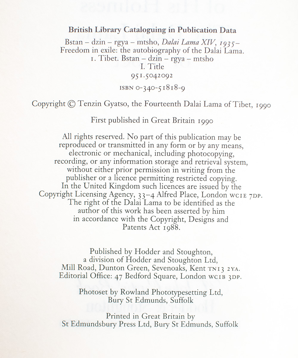 First British edition of The Dalai Lama's autobiography. Octavo, original cloth, illustrated. Fine in a fine dust jacket.