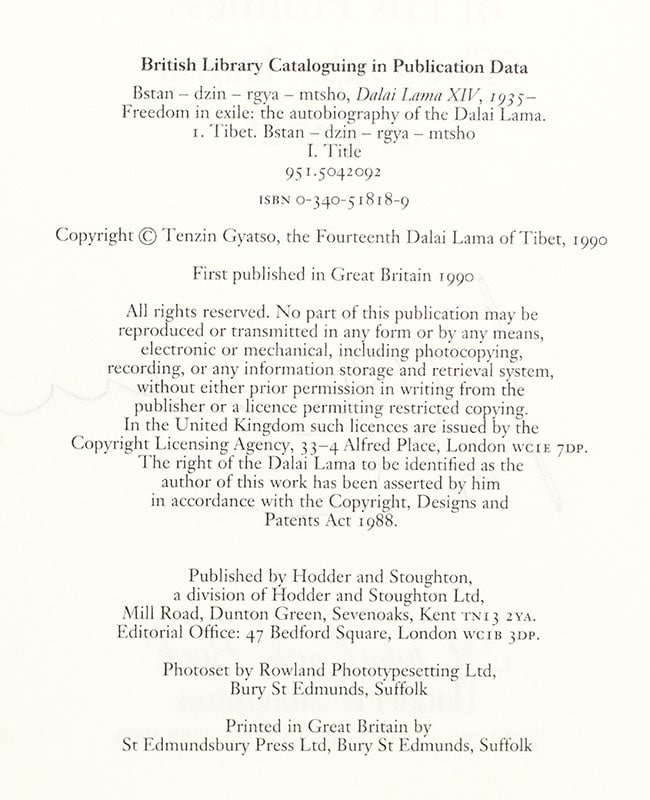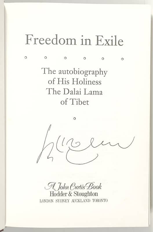 First British edition of The Dalai Lama's autobiography. Octavo, original cloth, illustrated. Boldly signed by His Holiness the Dalai Lama on the title page. Near fine in a near fine dust jacket. Uncommon signed.