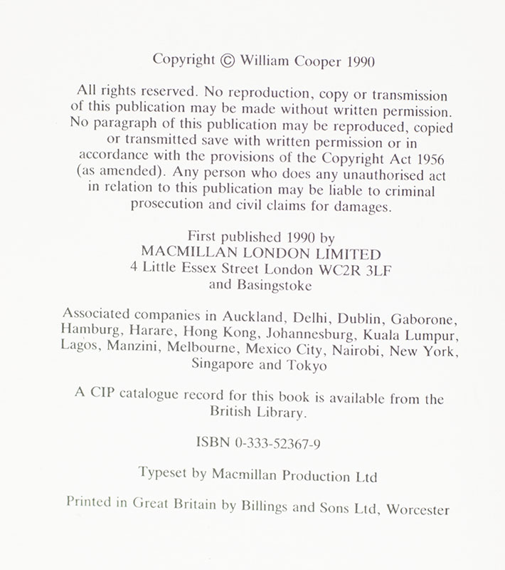 First edition of Cooper's collection of early recollections. Octavo, original maroon cloth. Association copy, inscribed by the author on the title page in the year of publication to Sally Soames, "For Sally It's fun to be photographed by [the author has drawn an arrow pointing to Sally's name] - you may now call me Harry Hoff! Signed by the author William Cooper London 22 July 1990." The recipient, British photojournalist Sally Soames, worked for The Sunday Times from 1968 until 2000 and was highly regarded for her exclusively black and white portraits of many of the most prominent figures of the 20th century including Menachem Begin, Margaret Atwood, Margaret Thatcher, Sean Connery, Rudolf Nureyev, Alec Guinness and Andy Warhol. Soames, who was known to be a warm and personal journalist, performed extensive research on her subjects and developed intimate rapports with them during her process, resulting in striking and revealing portraits. In addition to the several world leaders Soames came to know and photograph, she captured the unique personalities of some of the world’s most gifted authors, poets, and playwrights. She published two books of photographs during her lifetime: Manpower (1987) with text by Robin Morgan and an introduction by Harold Evans and Writers (1995) with a preface by Norman Mailer. Fine in a fine dust jacket. Jacket illustration by Paul Collicut.