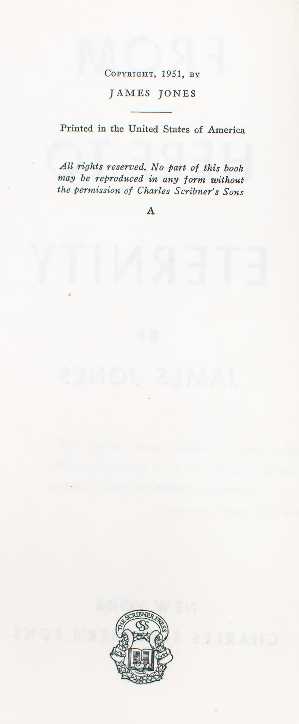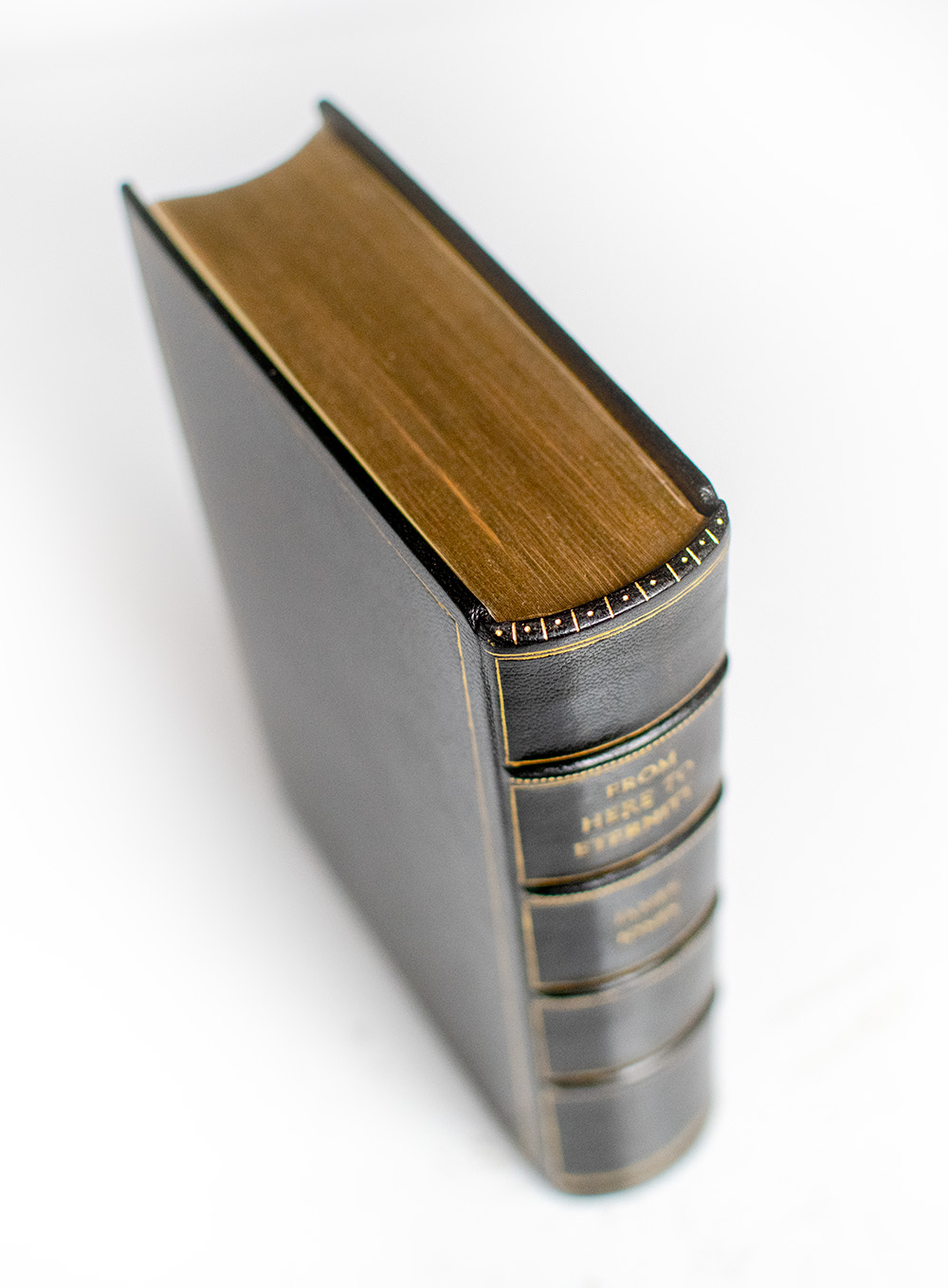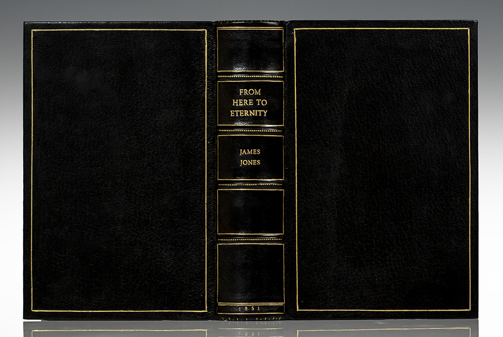 First edition of the author's first book, one of the great novels of World War II. Octavo, bound in full morocco by the Harcourt Bindery with gilt titles and tooling to the spine in six compartments within raised gilt bands, gilt ruling to the front and rear panel, gilt inner dentelles stamp-signed by the Harcourt Bindery, marbled endpapers, all edges gilt. Boldly signed by James Jones on a page bound-in. In fine condition.