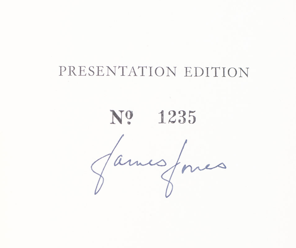First edition of the author's first book, one of the great novels of World War II. Octavo, original cloth. Presentation edition, signed by James Jones on the half-title page. Near fine in a near fine dust jacket. Jacket design by SKA. Jacket photograph by Pat Maestro.