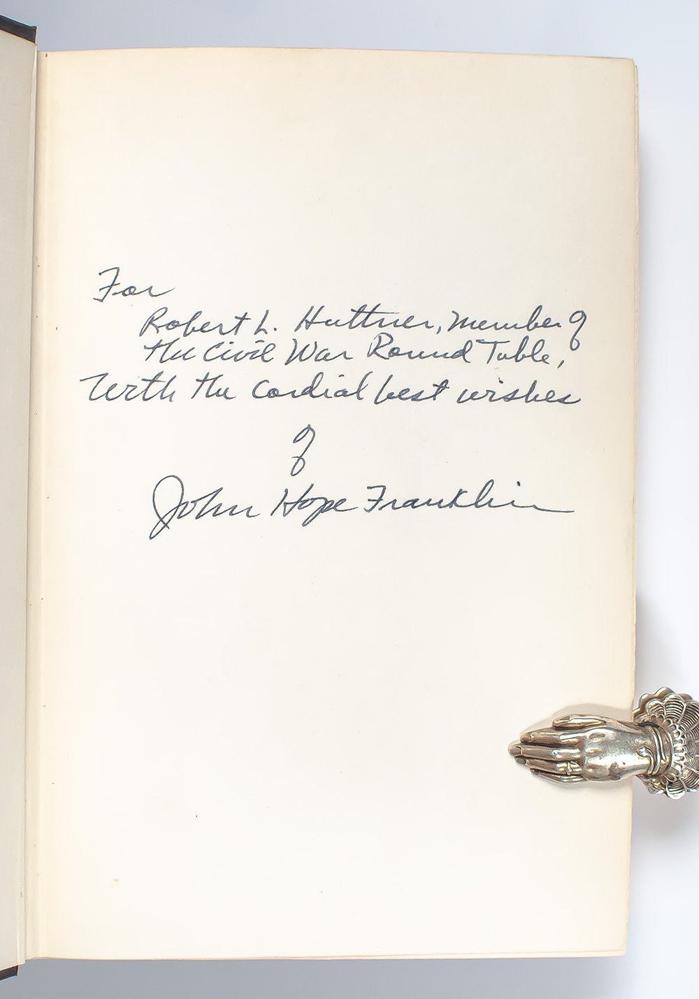 First edition of this "landmark in the interpretation of American civilization" (Robert W. Fogel), which has went on to sell over three million copies. Octavo, original cloth, illustrated. Presentation copy, inscribed by the author on the front free endpaper, "For Robert L. Huttner, member of the Civil War Round Table, With the cordial best wishes of John Hope Franklin." In near fine condition, bookplate of the recipient to the front pastedown. First editions are uncommon, especially signed.