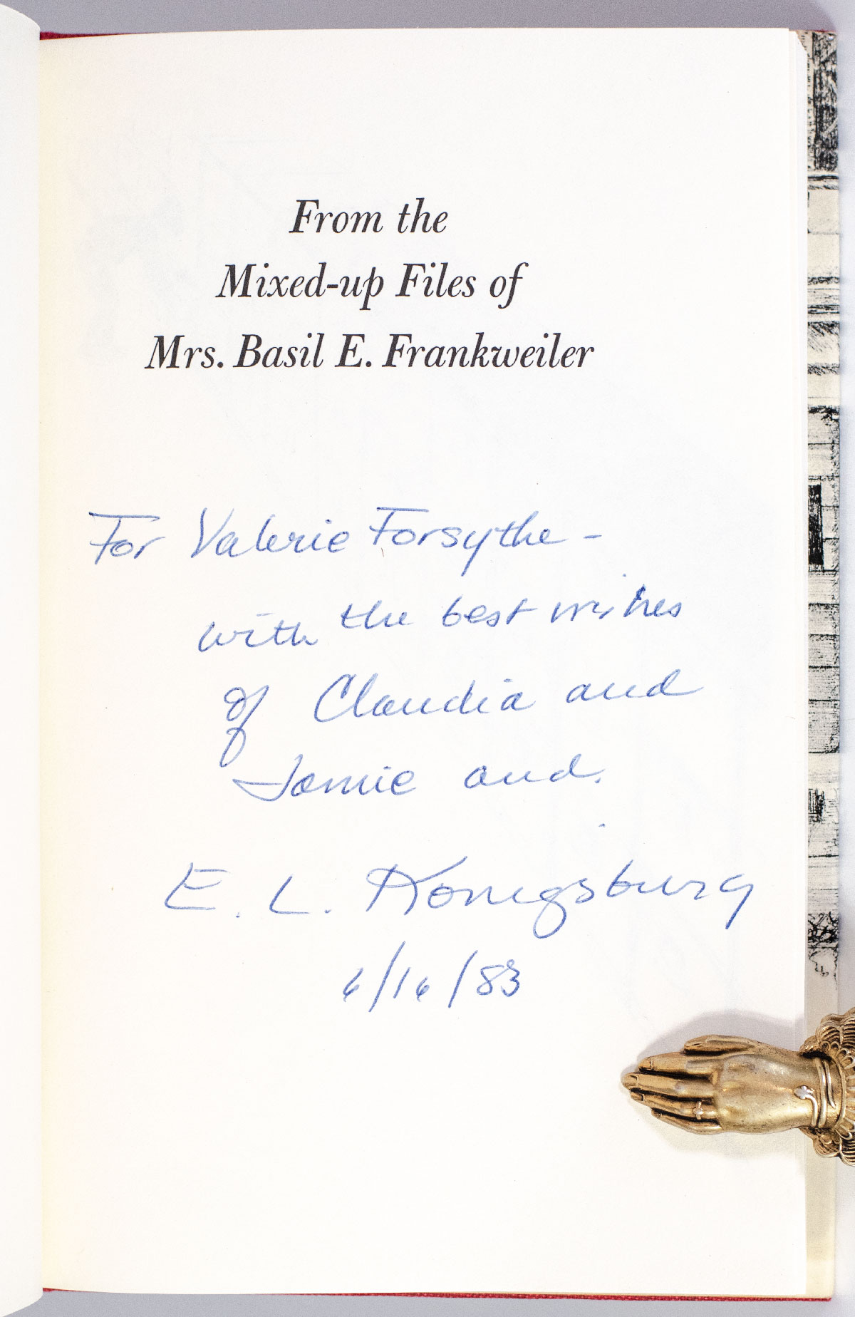 First edition, early printing of the author's Newbery Award-winning novel. Octavo, original cloth, illustrated by Konigsburg. Presentation copy, inscribed by the author on the half-title page, "For Valerie Forsythe- with the best wishes of Claudia and Jamie and E.L. Konigsburg 6/16.83." Fine in a fine dust jacket. An exceptional example, rare signed.