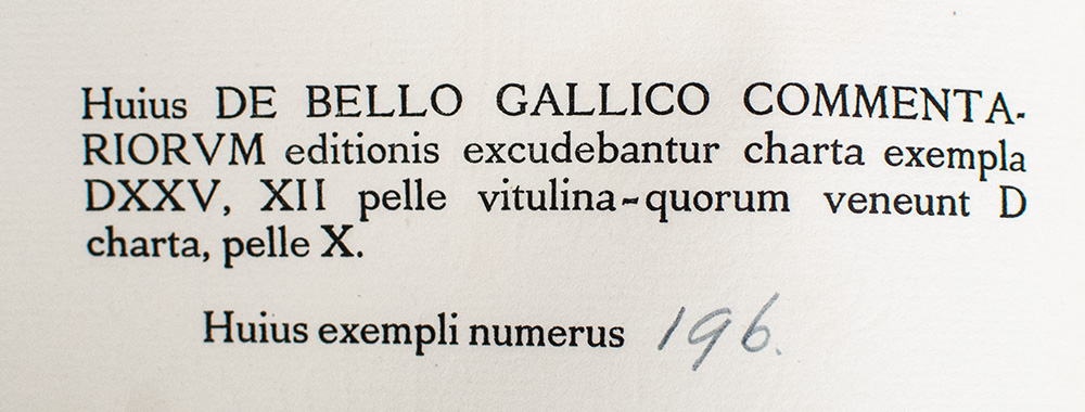 The Medici Society limited edition of this seminal firsthand account of Rome’s conquest of Gaul. Octavo, bound in full vellum with gilt titles to the spine and front panel, green silk ribbon ties, fully written in latin, and printed on handmade Riccardi Paper. One of 525 numbered paper copies, this is number 196. In near fine condition. Revised text by T. Rice Holmes. An exceptional example.