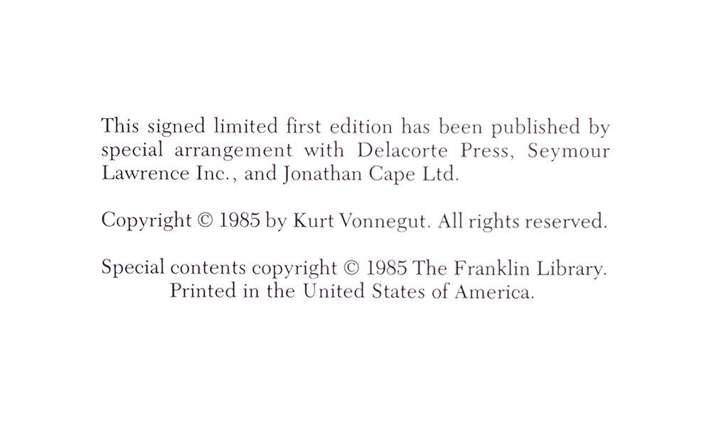 Signed limited edition of Vonnegut's eleventh novel. Octavo, original publisher's full leather elaborately decorated in gilt, marbled endpapers, all edges gilt, ribbon bound in, frontispiece by Anita Kunz. Signed by the author. In fine condition.