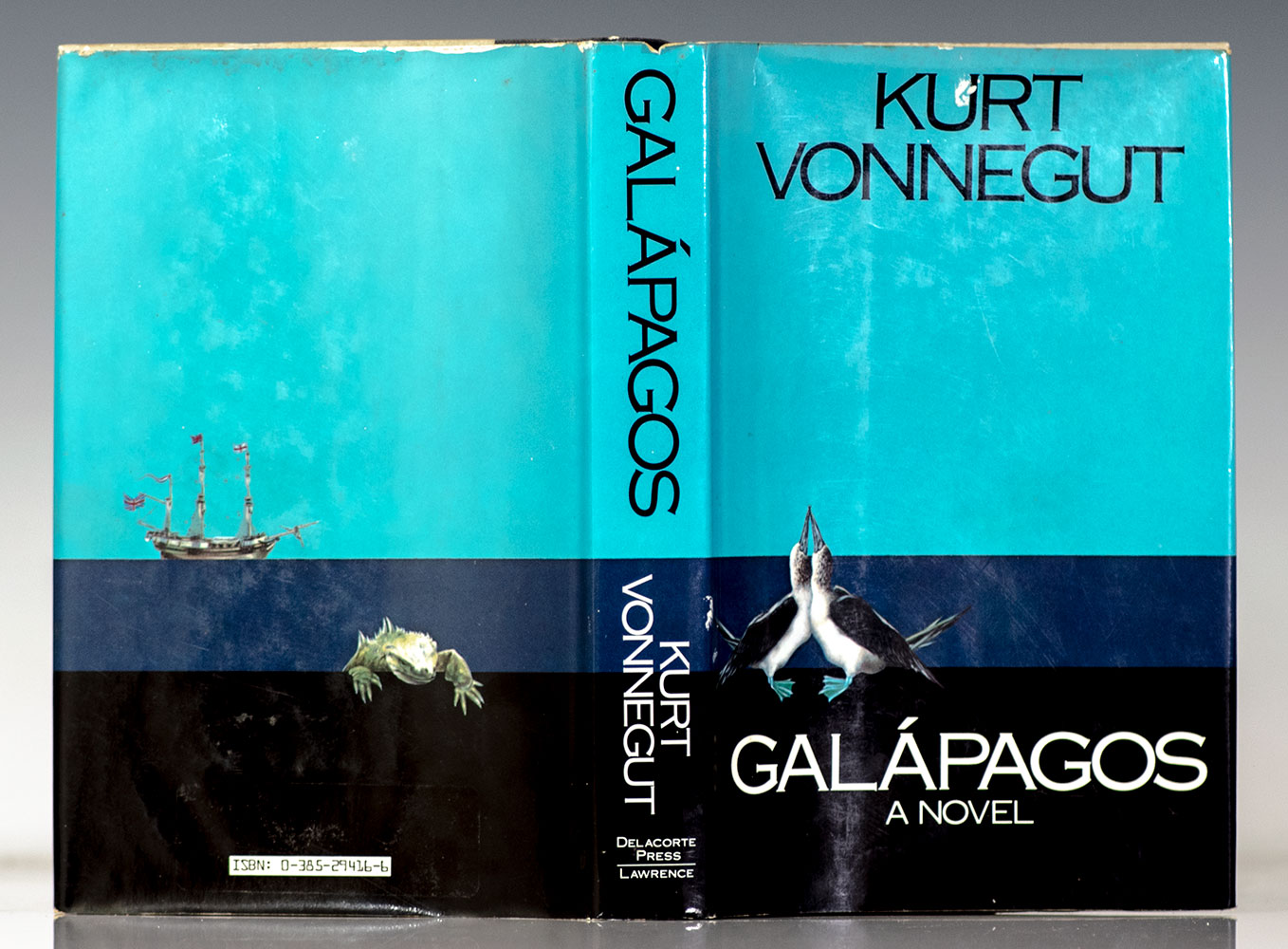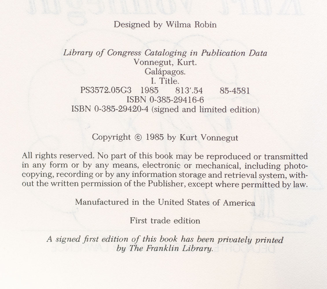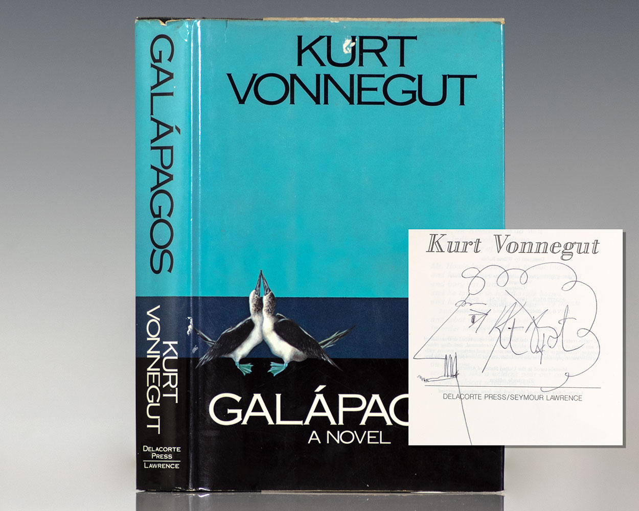 First edition of Vonnegut's eleventh novel, which questions the merit of the human brain from an evolutionary perspective. Octavo, original half cloth. Signed by Kurt Vonnegut on the title page with a self-caricature. Near fine in a very good dust jacket. Jacket illustration by Jeffrey Adams.