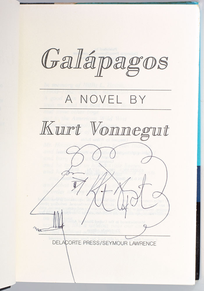 "In war, as in love, he was a fearless, happy-go-lucky adventurer": First Edition of Galapagos; Signed by Kurt Vonnegut with a self-caricature