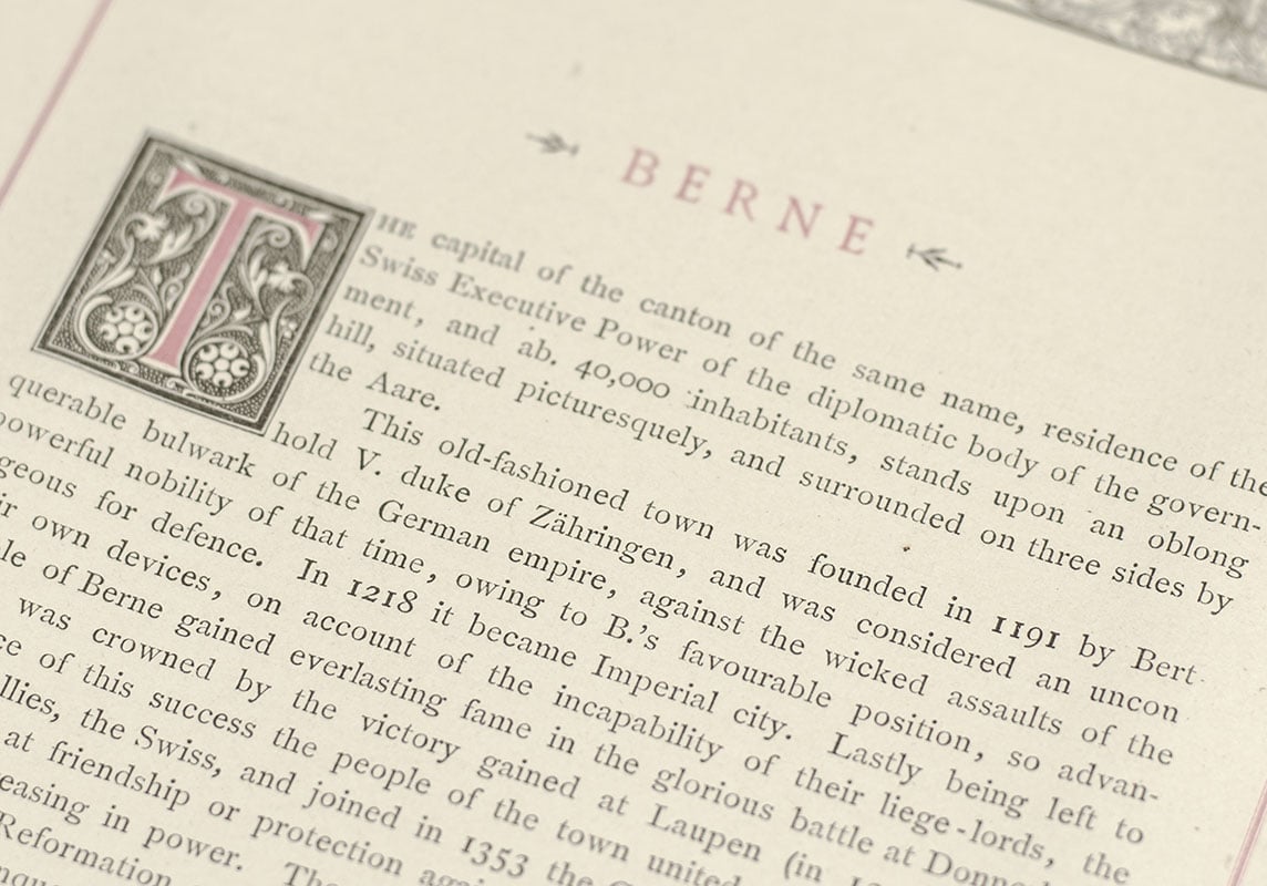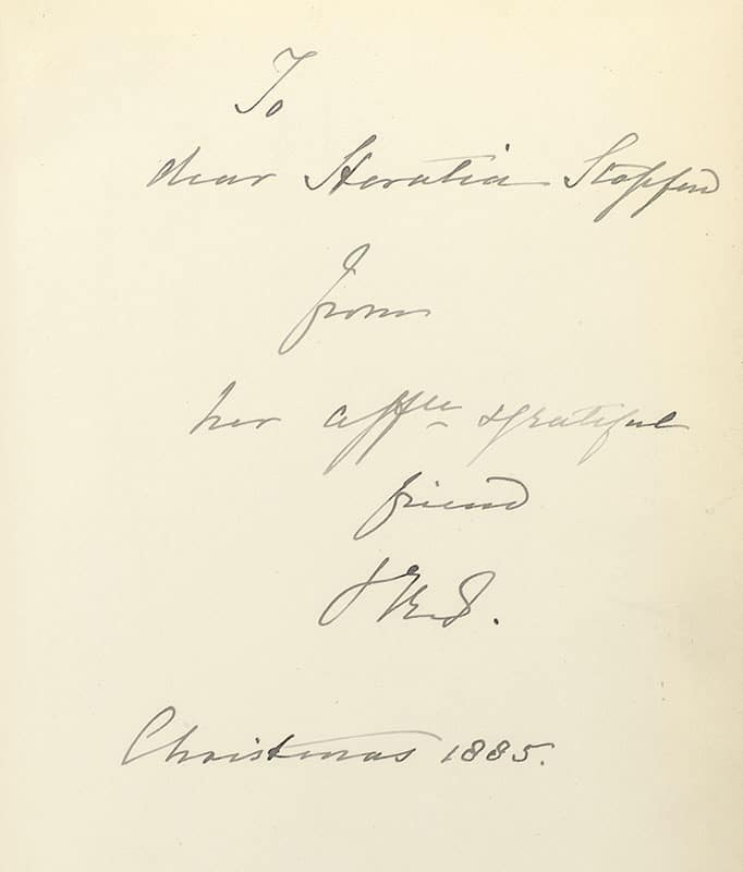 First edition of this extensive gallery of photographs of Switzerland. Quarto, original publisher's full decorative vellum with gilt titles to the spine and elaborate gilt central motif to the front panel depicting an alpine postal carriage, all edges gilt, gilt patterned endpapers, illustrated with one hundred collotypes displaying views of Switzerland. Presentation copy, with a full page inscription from Queen Victoria to Horatia Stopford, a Lady of her Bedchamber, "To dear Horatia Stopford from her affec. & grateful friend Victoria R Christmas 1885." In near fine condition.