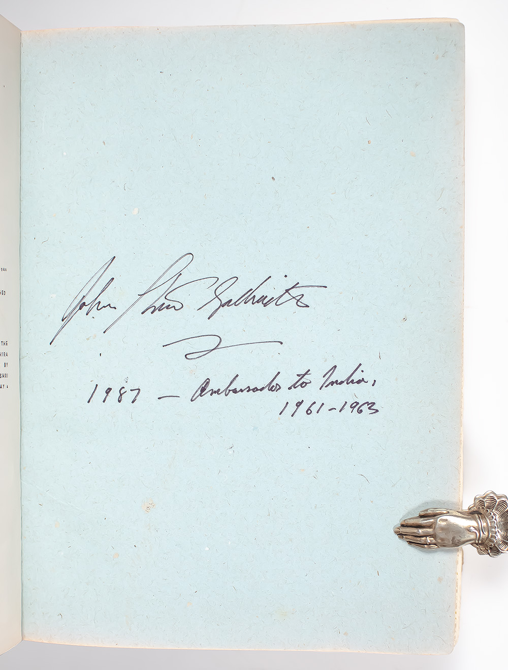 First unabridged edition of this tribute to Gandhi, with introductions by Gandhi and Jawaharlal Nehru and a biographical essay by Albert Einstein. Quarto, original publisher's half cloth, patterned endpapers, illustrated with black and white photographs and tipped-in color plates, frontispiece. Boldly signed by Mahatma Gandhi on the half-title page. Association copy, additionally signed by John Kenneth Galbraith opposite the copyright page, "John Kenneth Galbraith 1987 -- Ambassador to India, 1961-1963." Although he remains best known as an iconoclast in the field of economics, John Kenneth Galbraith was very active in Democratic Party politics, serving in the administrations of Franklin D. Roosevelt, Harry S. Truman, John F. Kennedy, and Lyndon B. Johnson. During his time as an adviser to President John F. Kennedy, Galbraith was appointed United States Ambassador to India from 1961 to 1963. Kennedy considered India to be important not just in its own right, but also because an Indian diplomat always served as the chief commissioner of the International Control Commission (ICC). Thus, Galbraith came to be involved in American policy towards Southeast Asia from his perch as an ambassador in New Delhi. During his tenure in India, Galbraith developed close ties with Prime Minister Jawaharlal Nehru and engaged deeply with the political and cultural life of the country. He expressed admiration for India’s experiment in democratic socialism and non-alignment, and he frequently drew comparisons between Nehru’s political legacy and that of Mahatma Gandhi. While Galbraith did not interact directly with Gandhi—who had been assassinated in 1948—he often invoked Gandhian ideals in his reflections on India’s development and its moral role in the post-colonial world. His writings and diplomatic efforts emphasized the importance of non-violence, civil society, and moral leadership, themes closely associated with Gandhi’s philosophy. In very good condition. A wonderful association copy, very rare and desirable signed by Gandhi and even more so with the addition of Galbraith's signature.