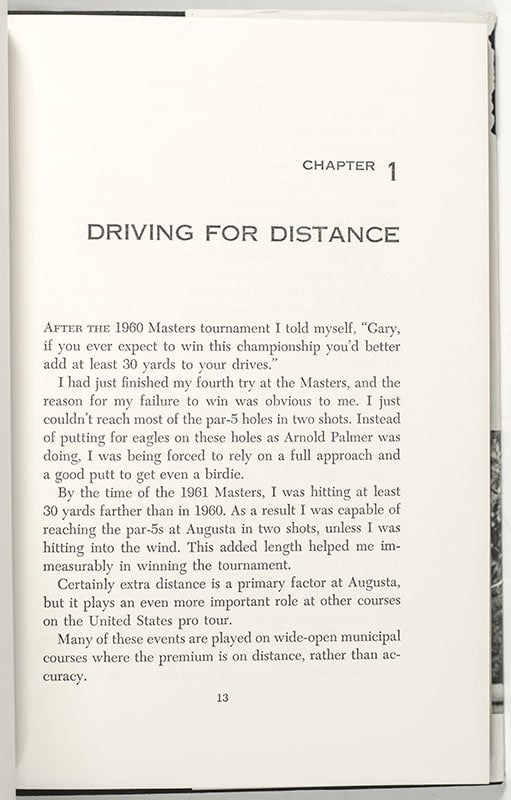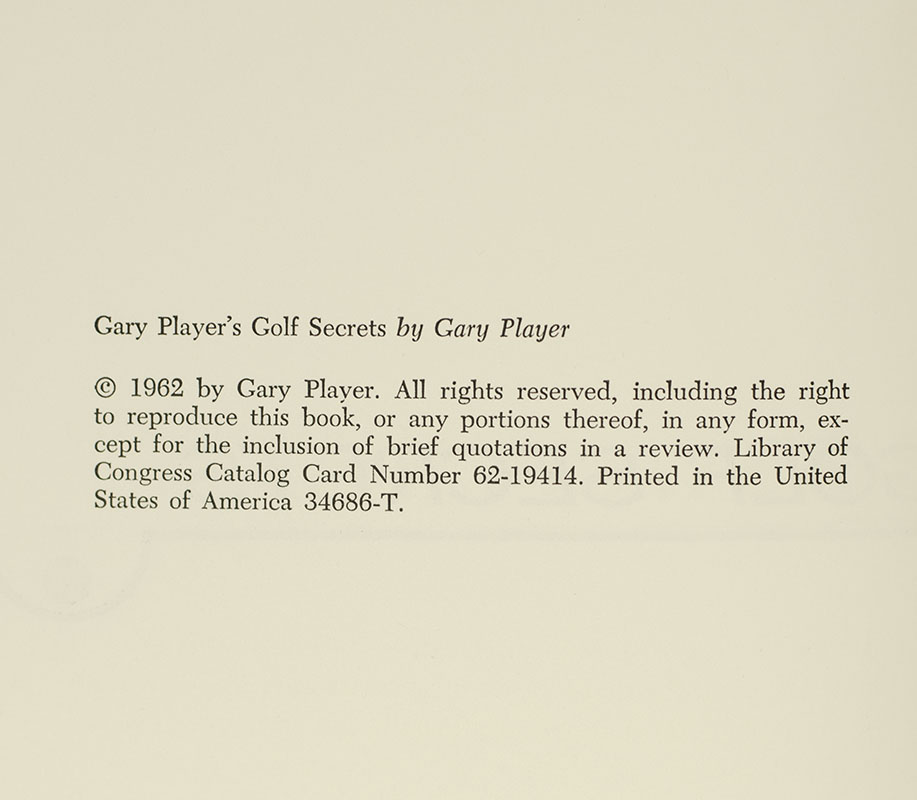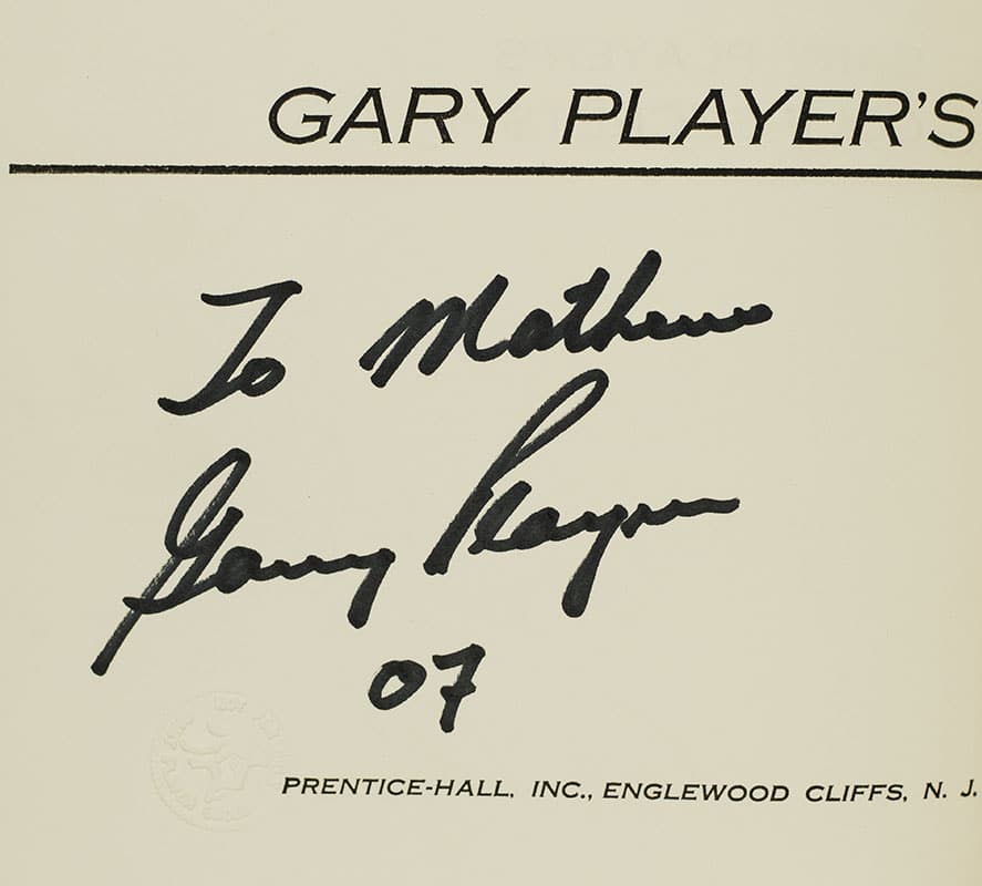 First edition of Gary Player's first book. Octavo, original cloth, illustrated. Inscribed by Gary Player on the title page and additionally signed by Player on the front panel of the dust jacket. Fine in a good dust jacket with a large chip to the rear panel.