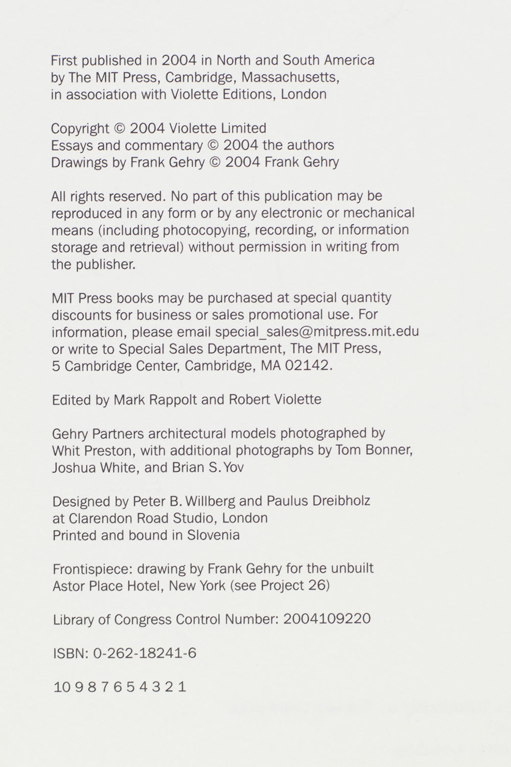 First edition of the Canadian-born American architect's book of architectural drawings. Octavo, original cloth, silver endpapers, illustrated. Boldly signed by Frank Gehry on the title page. Fine in a fine dust jacket. Essays by Horst Bredekamp, Rene Daalder, and Mark Rappolt. Commentary by Frank Gehry, Edwin Chan, and Craig Webb. Edited by Mark Rappolt and Robert Violette.