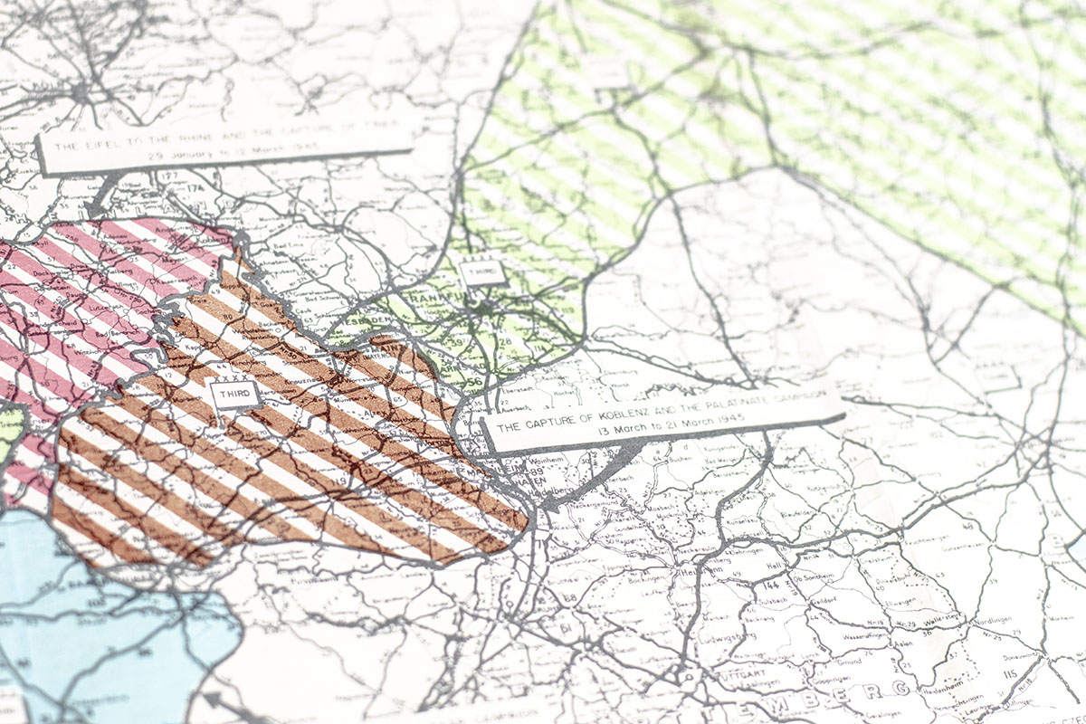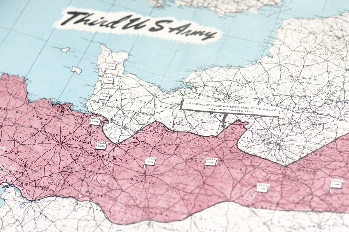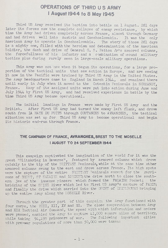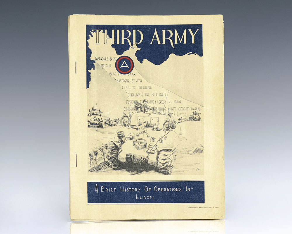 Black and white photographic print of Commanding General George Smith Patton, signed by him. One page, taken from the "Third Army: A Brief History of Operations in Europe" historical booklet, signed by Patton in the upper right corner and annotated below his image "Autographed Nov. 1945." From the collection of 2nd Lt. John Papay, the officer in charge of security at Patton’s headquarters with a gold plaque commemorating the association. Matted and framed. The entire piece measures 16 inches by 14.25 inches. In near fine condition. A rare and desirable association, signed to Patton's security officer in the month prior to Patton's tragic death in December 1945.