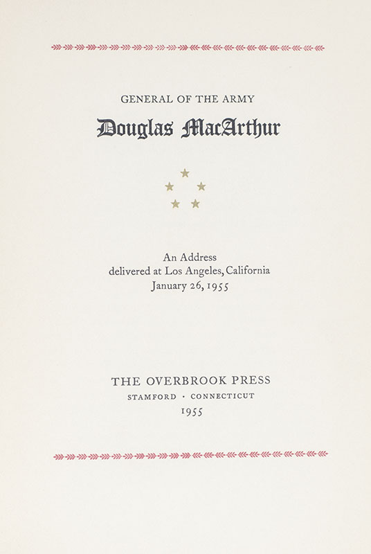 First edition of this address delivered by General Douglas MacArthur at Los Angeles, California January 26, 1955 in which he discusses the current state of the nation. Octavo, original wrappers as issued. In near fine condition. Scarce.