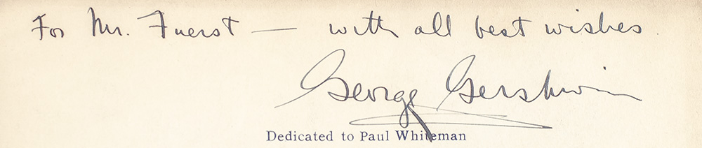 Rare 1925 printing of the piano score for the orchestral composition that defined the jazz age, first published in 1924. Small folio, original illustrated wrappers, piano solo and second piano in score. Presentation copy, inscribed by George Gershwin on the title page, "For Mr. Fuerst - with all best wishes George Gershwin." The recipient, Eugene Fuerst, was conductor and director of the Portland Civic Opera Association and the Theater Arts Opera Association. In very good condition with some loss and creasing to the cover and slight toning to the title page. A beautiful signature from Gershwin.