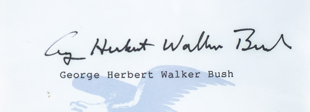 Typed inaugural address signed by the 41st President of the United States with a rare full signature, "George Herbert Walker Bush." One page, typescript, the souvenir inaugural address measures 4.75 inches by 3.25 inches, signed at the conclusion with Bush's rare full signature, "George Herbert Walker Bush." The address reads in full, 'I, George Herbert Walker Bush, do solemnly swear that I will faithfully execute the Office of President of the United States, and will, to the best of my ability, preserve, protect and defend the Constitution of the United States, so help me God.' Matted and framed with a plaque and portrait of George H.W. Bush. In fine condition. The entire piece measures 21 inches by 16.5 inches.