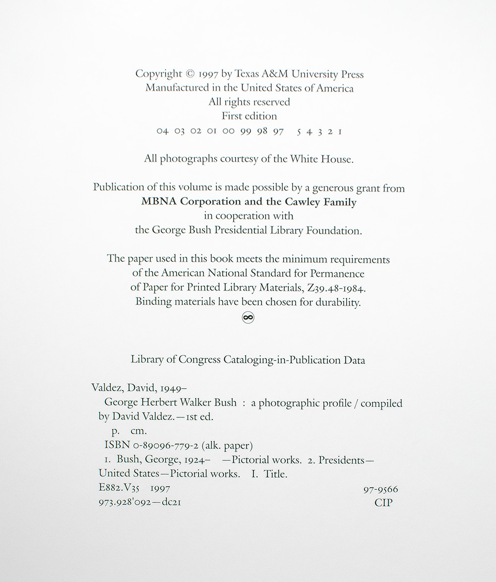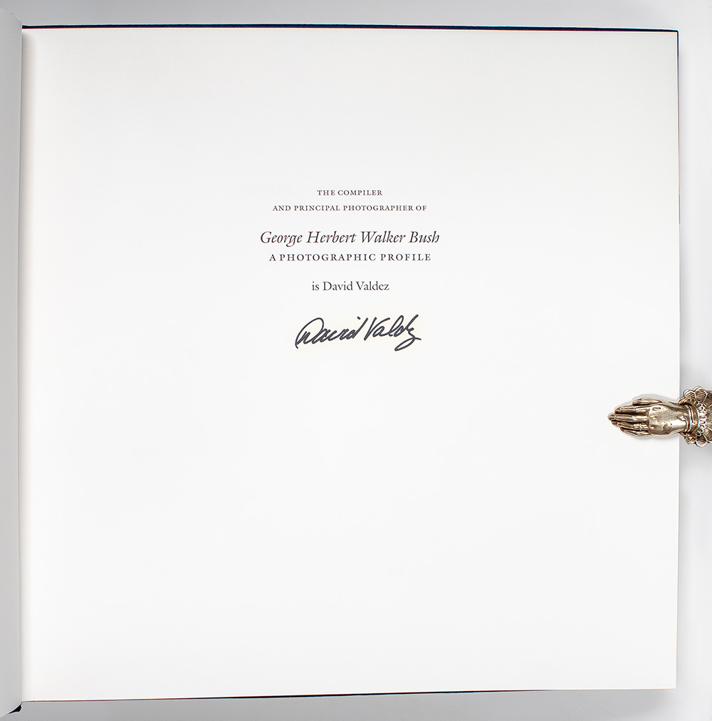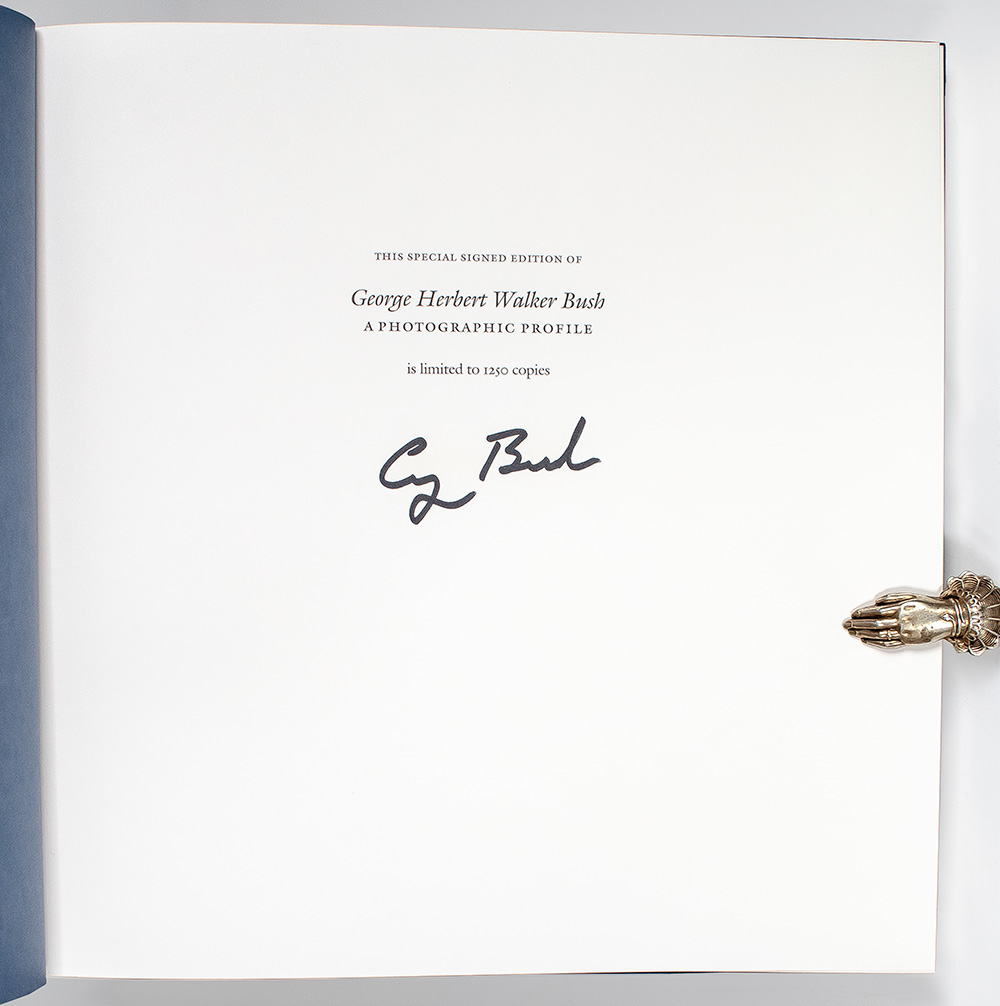 First edition of this photographic profile of the 41st President of the United States. Quarto, original dark blue cloth. One of 1250 copies signed by George H.W. Bush and George Valdez on their respective pages. Fine in a fine slipcase.