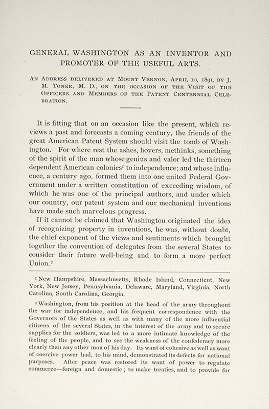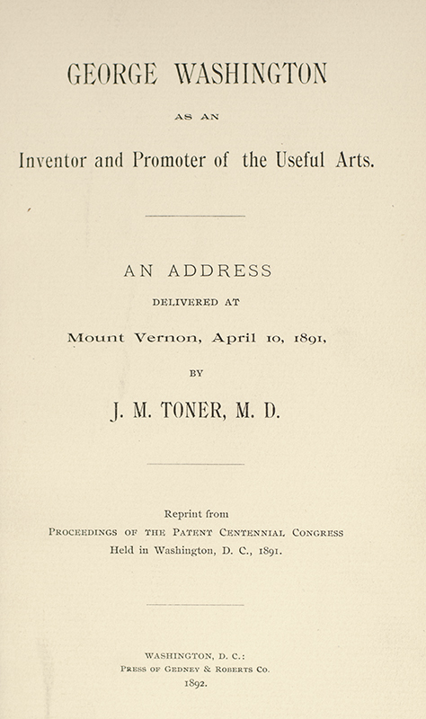 George Washington as an Inventor and Promoter of the Useful Arts. An Address Delivered at Mount Vernon, April 10, 1891, by J.M. Toner, M.D.