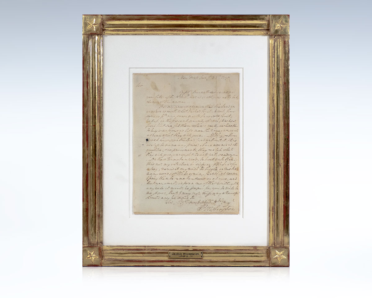 Rare autograph letter signed by George Washington as the first President of the United States. Quarto, one page, the letter reads in full, "New York Jany 24th 1790 Sir Capt. Burnett delivered me your letter of the 18th and is so obliging as to take charge of this answer - It is my sincere opinion that the land mentioned in it is worth what I asked for it--to wit four dollars per acre and once would have sold for it; but if, in the present scarcity of cash it rather fetch that sum, let those who are really inclinable to buy, come forward, like men that are in earnest, and say what they will give--If they, or their Agent have seen the land, (and without this it is useless to name any price) have examined its qualities and improvements, they can say what they will give, and ought to act with candour. -On these terms I am ready to treat with them. It is not my intention to dispose of the land for a song, nor is it my wish to higgle, or make many words to the bargain--for which reason I pray them to come to a decision at once, and that you would inform me of the result. At any rate it would be proper for you to write to me, & soon, that I may not miss any other offer should any be made to. Sir, Yr most Obed. Hble Serv G Washington." In very good condition, silked on recto and verso. Matted and framed. The entire piece measures 18 inches by 15 inches. An exceptional letter.