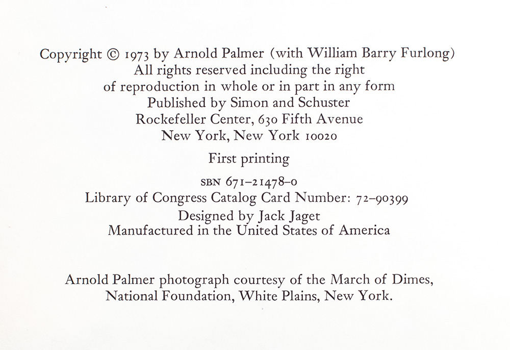 First edition of this autobiographical golf instruction book from 'The King' of golf. Octavo, original cloth. Signed by the author on the fly leaf, "Best Wishes Arnold Palmer." Near fine in a near fine dust jacket. Jacket design by Ken Braren.