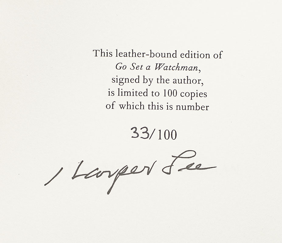 Signed limited edition of the author's second novel. Octavo, bound in full morocco. One of a 100 numbered copies, signed by Harper Lee. Housed in a custom clamshell box. In fine condition.
