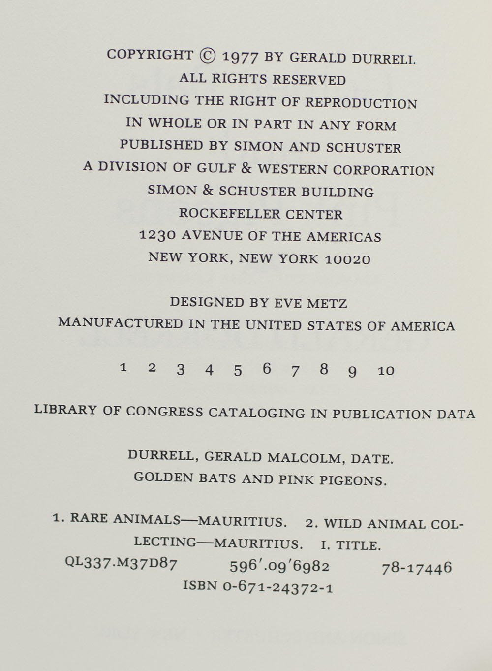 First Edition of Gerald Durrell's Golden Bats and Pink Pigeons; Signed by Him