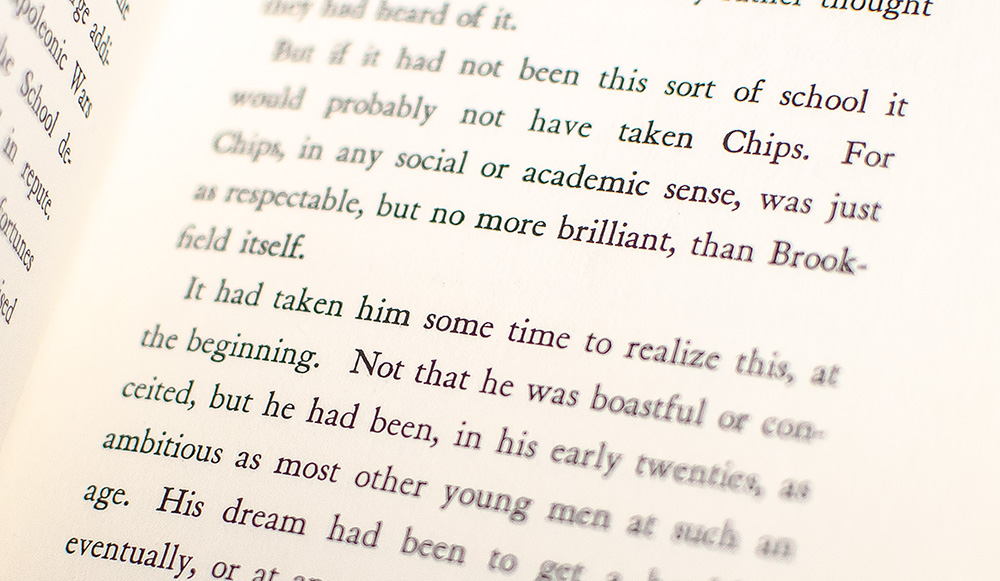 Originally issued in 1933, as a supplement to the British Weekly, James Hilton's novella Goodbye, Mr. Chips tells the story of a beloved schoolteacher, Mr Chipping, and his long tenure at Brookfield School, a fictional minor British boys' public boarding school located in the fictional village of Brookfield, in the Fenlands. The story was adapted into a 1969 musical film starring Peter O’Toole and Petula Clark, with songs by Leslie Bricusse and an underscore by John Williams.