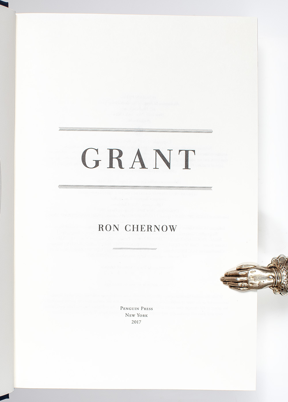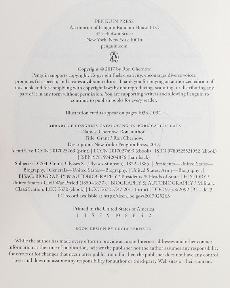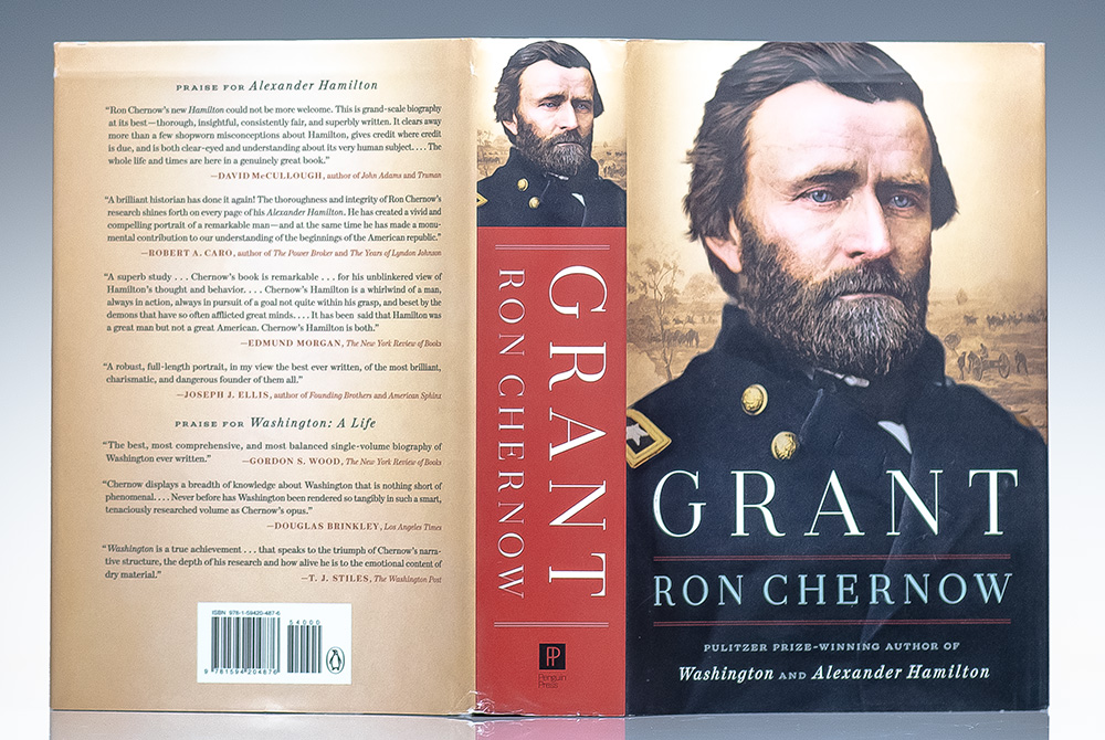 First edition of this award-winning biography of Ulysses S. Grant. Octavo, original boards, illustrated. Boldly signed by Ron Chernow on a Penguin Press bookplate to the half-title page. Fine in a near fine dust jacket. Jacket art by Evan Gaffney. Author photograph by Beowulf Sheehan.