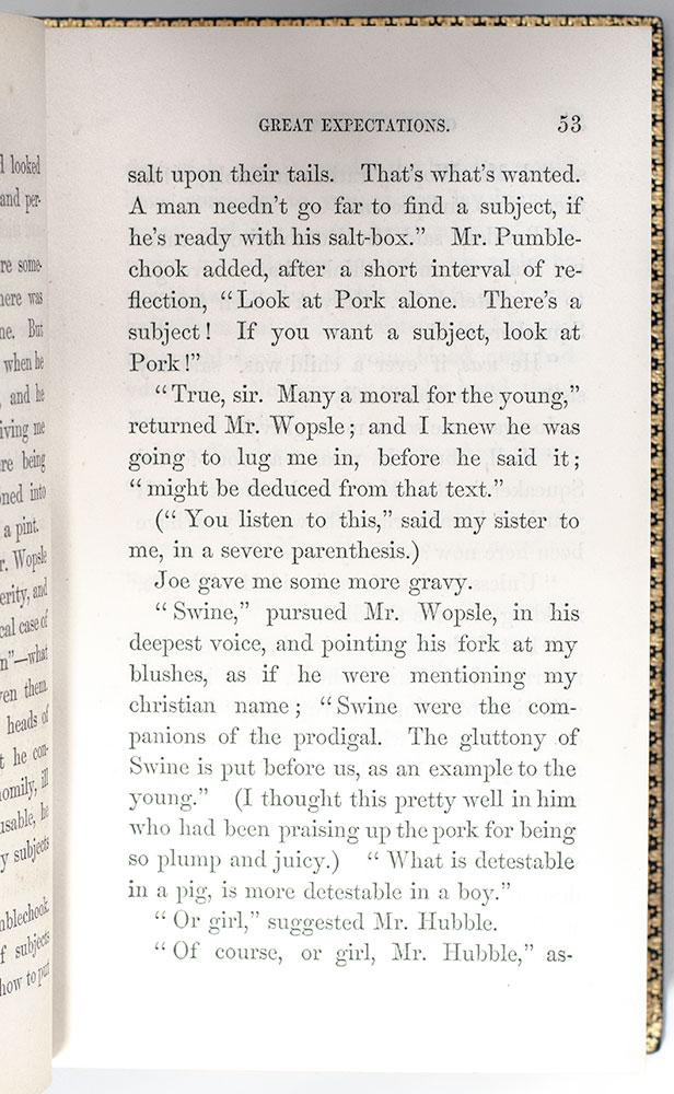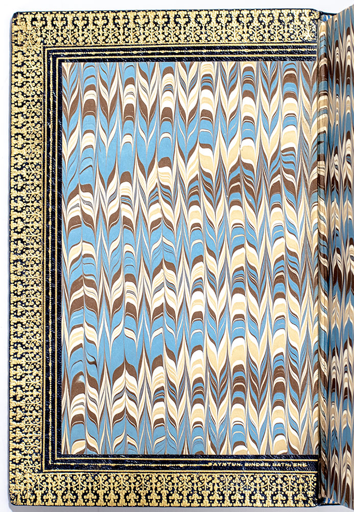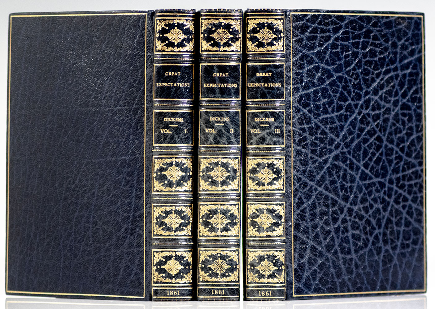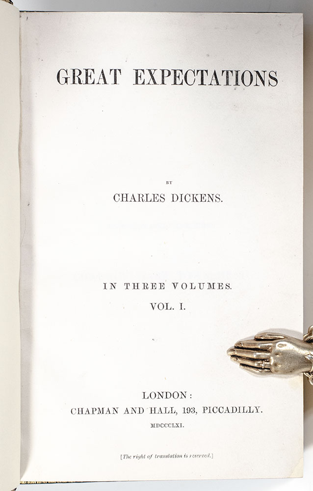 First edition, first impression of Dickens' rarest novel. Octavo, three volumes bound in full royal blue crushed levant morocco by Bayntun Bindery with gilt titles and tooling to the spine in six compartments within raised gilt bands, gilt ruling to the front and rear panels, gilt turn-ins and wide gilt inner dentelles stamp-signed by Bayntun, all edges gilt. The earliest impression of Dickens' rarest novel. This copy agrees in all points with Margaret Caldwell's extensive analysis of the differing impressions in the Clarendon edition of Great Expectations. As in the Lawrence Drizen copy sold in 2019 at Sotheby’s and in the Clarendon edition, the third volume here contains the numeral “3” in the pagination on p. 103, and the initial “i” in “inflexible” on p. 193, which are sometimes missing in copies of the first impression of the third volume, indicating that the present copy is among the earlier printings of the first impression. Smith comments that “the rarity of the first issue of Great Expectations has been attributed to the probable small binding-up of copies with the first title-page, coupled with the fact (according to C.P. Johnson, “Hints to Collectors”) that “the first edition was almost entirely taken up by the libraries.” Only 1,000 copies of the first issue and 750 copies of the second were printed and that probably most of the first and more than half of the second (1400 copies in all) were purchased by Mudie’s Select Library. Eckel, pp. 91-93; Sadleir 688; Smith I:14. In fine condition. An exceptional example of one of Dickens' great masterpieces.