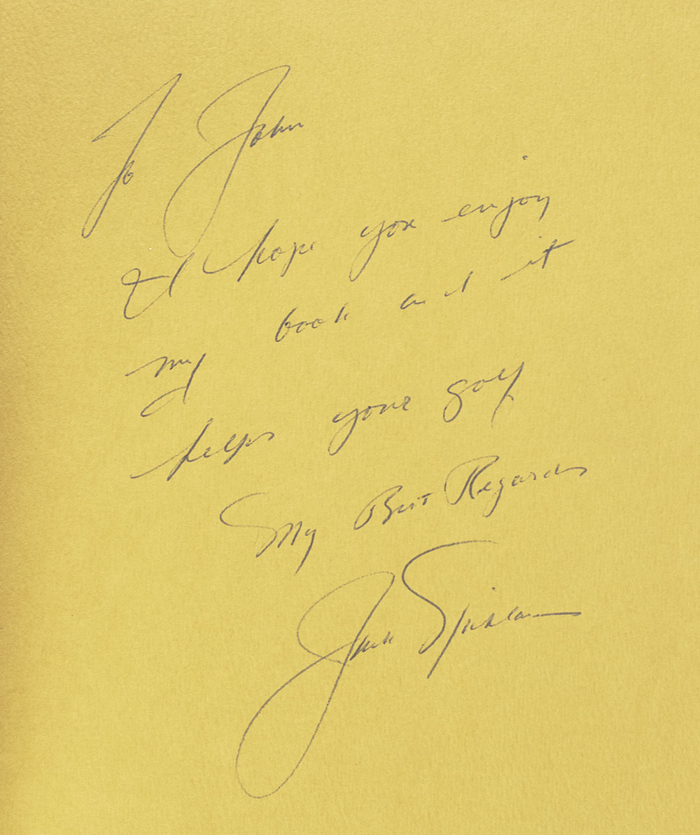 First British edition of the golfer's autobiography, which includes six full chapters on instruction. Octavo, original cloth, illustrated. Presentation copy, lengthily inscribed by the author on the front free endpaper, "To John I hope you enjoy my book and it helps your golf My Best Regards Jack Nicklaus." Fine in a very good dust jacket. Jacket design by Milton Charles. Foreword by Robert Tyre Jones, Jr.