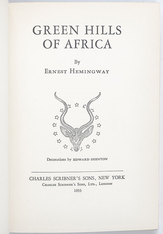 First edition of Hemingway's second work of nonfiction, an account of a month on safari he and his wife took in East Africa during December 1933. Octavo, original green cloth, decorations by Edward Shenton. Near fine in a bright very good dust jacket.