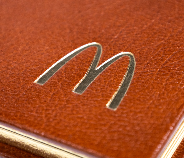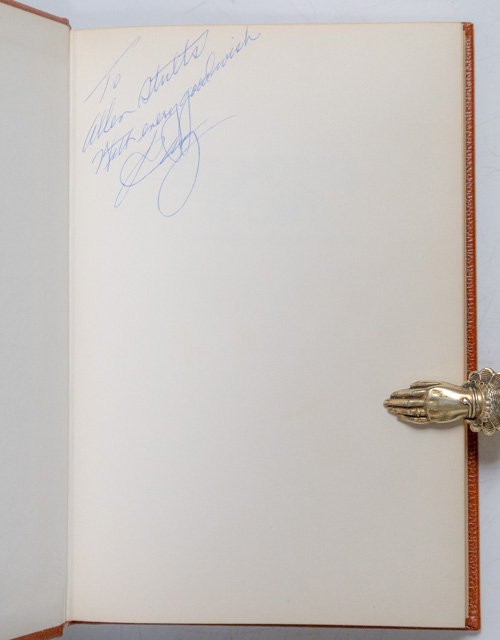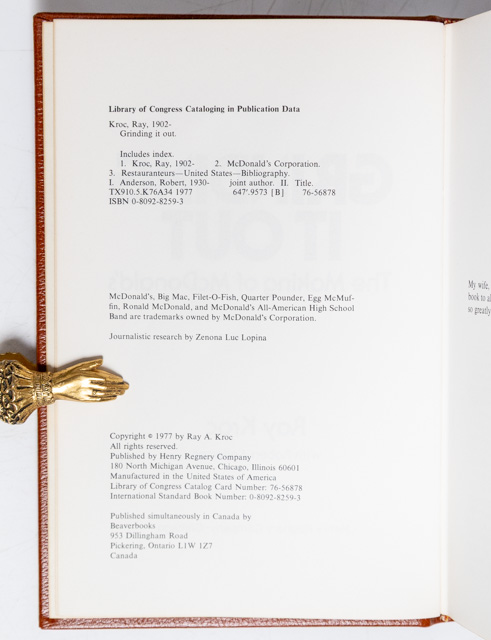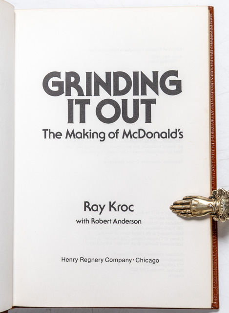 First edition of this classic work. Octavo, original leather, gilt titles to the spine, all edges gilt, illustrated. Association copy, inscribed by the author on the front free endpaper, "To Allen Stults with every good wish Ray." The recipient Allen Stults was a close business partner of Ray Kroc and a member of the Board of Directors for McDonald's Corporation. Known for helping to build the company, he was described as a key associate in the early days of McDonald's, as noted in this work "Grinding It Out: The Making of McDonald's". An exceptional association.