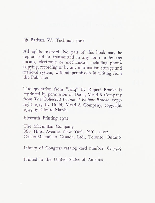 Early printing of Tuchman's Pulitzer Prize-winning account of the opening episodes of World War I. Octavo, original black cloth, cartographic endpapers, illustrated. Association copy, inscribed by the author to fellow historian Arnold Krammer opposite the half-title page, "For Arnold Krammer with best wishes Barbara Tuchman." The recipient, Arnold Krammer was a historian who specialized in German and United States history and a professor at Texas A&M University in College Station, Texas. He was twice a Fulbright scholar in Germany in 1992-1993 and 2002-2003. He was the author of seven books, the most recent of which was War Crimes, Genocide, and the Law: Historical Perspective, published in 2009. He is a co-author of five other books and has penned scores of historical articles and book reviews in various learned journals, such as The Journal of Contemporary History, Slavic Review, The Russian Review, German Studies Review and Journal of Military History. Fine in a near fine dust jacket. Jacket design by Ellen Raskin. An excellent association.