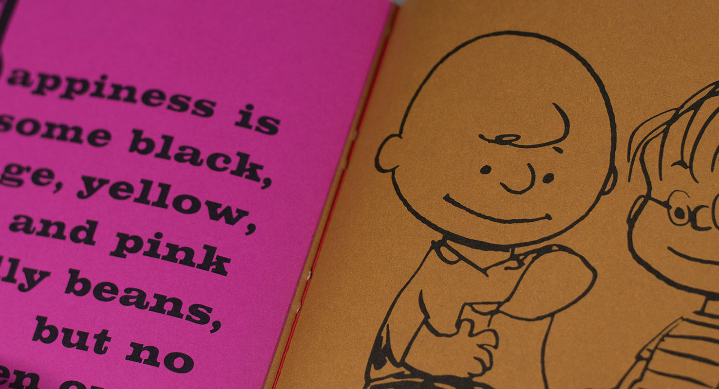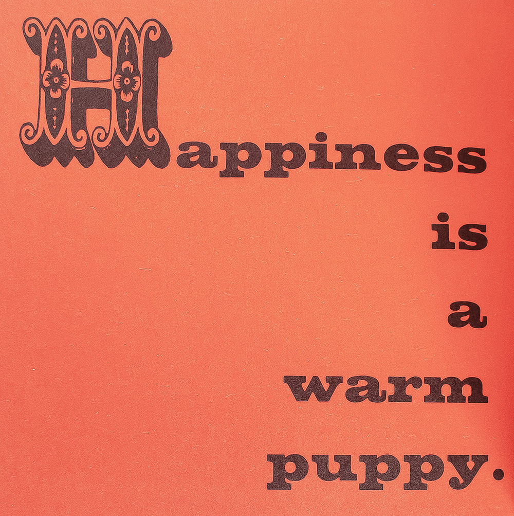 Before Happiness is a Warm Puppy, Schulz had published only collected “Peanuts” strips; this is the first Peanuts book to appear in a format of original text and illustrations, on colored paper. The small volume enjoyed great success, spending 45 weeks on the New York Times best-seller list, reaching as high as the number two spot.