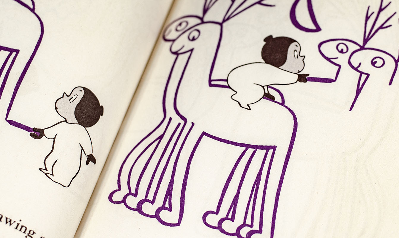 Crockett Johnson—a pen name for David Johnson Liesk—was “a cartoonist whose simplest, sparest and boldest outlines produced unforgettable, gently humorous and always endearing caricatures… His natural gift for drawing and writing from a young child’s viewpoint enabled him to craft more than 20 juvenile books,” including this, his most popular one. “With the fewest of lines, Johnson depicts Harold as a toddler clad in sleepers, his chubby hand gripping a fat plum-colored crayon. From page to page, the thick, firm, purple mark delineates Harold’s actions against the stark white background so effectively and ingeniously that the crayon is as much a character as Harold. The same economy that informs Johnson’s art permeates his text; he writes so concisely of Harold’s moonlight stroll that his style perfectly echoes the clarity of his boldly outlined cartoon illustrations” (Silvey, 355).