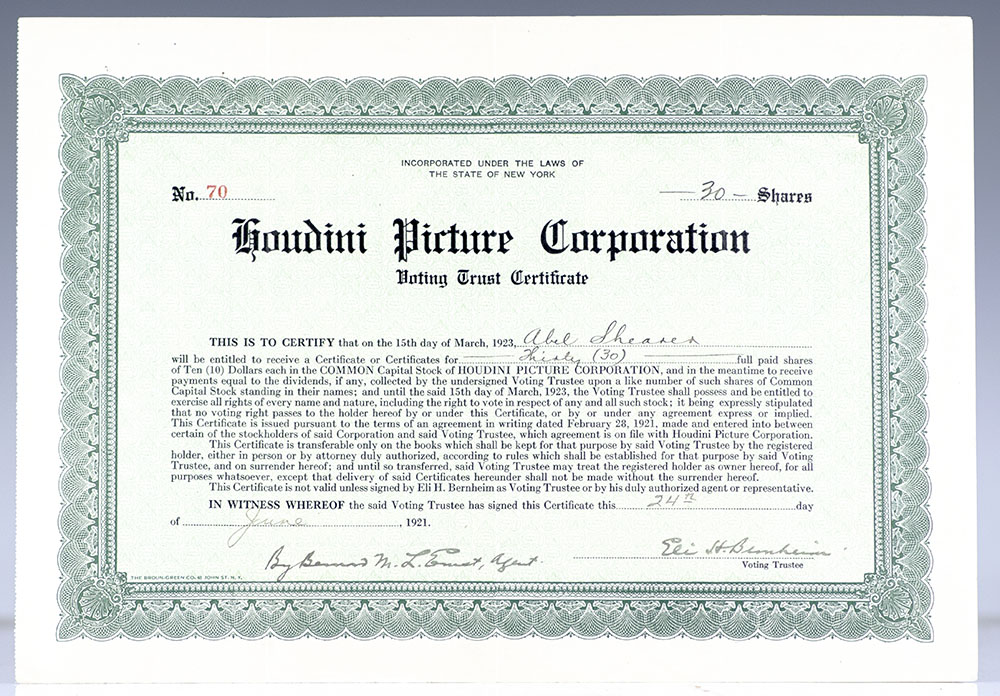 Rare stock certificate signed by the world’s greatest escape artist, master illusionist Harry Houdini. One page, partially printed in brown and black ink with an embossed seal, the document is dated January 23, 1922 and certifies that W.E. Jefferson hereby owns twenty shares of the Capital Stock of Houdini Picture Corporation. Signed by Harry Houdini as President of the Corporation and countersigned by Harry H. Poppa as Assistant Treasurer. In near fine condition. With a Houdini Picture Corporation Voting Trust Certificate awarding 30 shares of common capital stock of Houdini Picture Corporation to Abel Shearer.