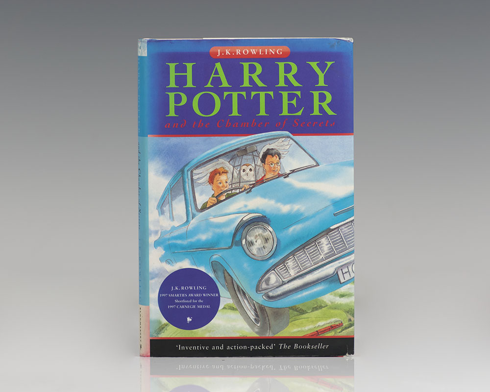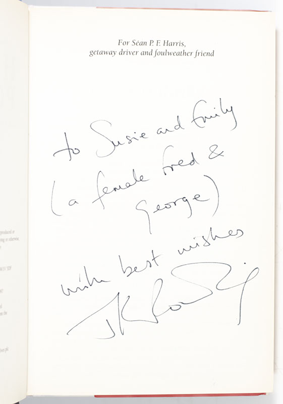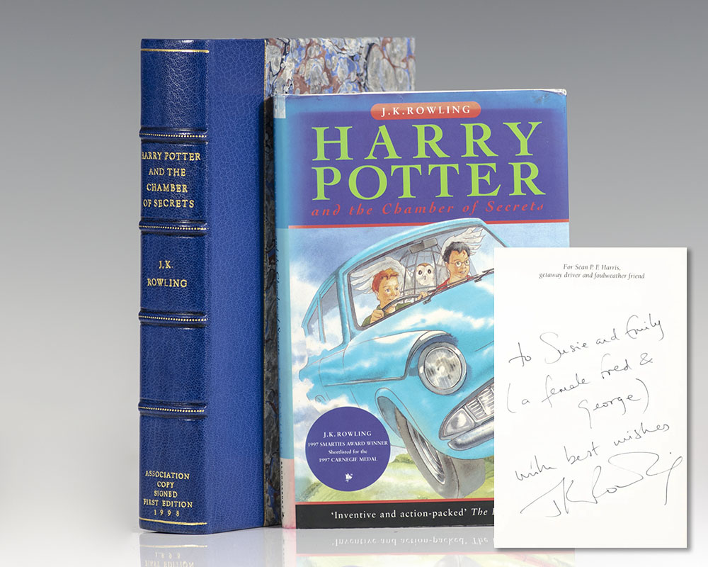 First edition, first issue of the second novel in Rowling's Harry Potter series. Octavo, original illustrated boards. Association copy, inscribed by J.K. Rowling on the dedication page, "Susie and Emily (a female Fred & George) with best wishes J.K. Rowling." The recipients, redhead twins Susie and Emily, were family friends of Bryony Evens, whom they accompanied to the Cheltenham Literary Festival where Rowling inscribed the present volume. The inscription refers to Harry Potter character Ron Weasley's elder twin brothers and fellow redheads, Fred and George. Bryony Evens was one of the first people to read the beginning chapters of the first book in the series, Harry Potter and the Philosophers Stone, the first to recognize the work's inherent value, and perhaps the most instrumental figure in getting the book published. Working at the time at Christopher Little Literary Agency, Evens was the first point of contact in receiving and sorting unsolicited manuscripts. Evens read Rowling's submission of the first three chapters of the book and passed it along to Little, who approved that she obtain the full manuscript and promote it to suitable publishers. Given a small budget, Evens was only able to print three manuscripts to pitch to publishing houses and, after twelve months and twelve rejections, was finally given the green light by editor Barry Cunningham from Bloomsbury in London. Fine in a near fine dust jacket with toning to the spine. Jacket design by Cliff Wright. An exceptional association.