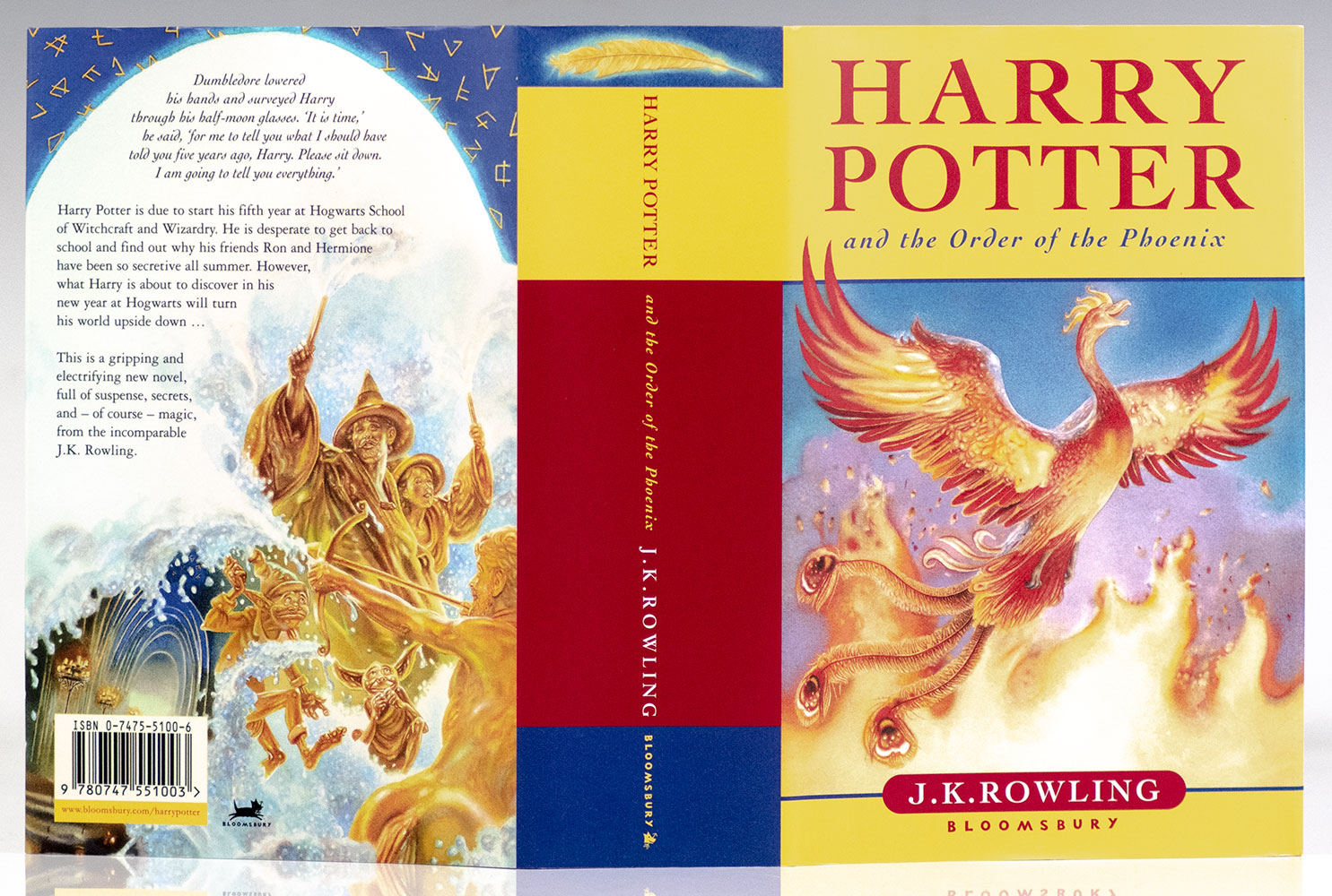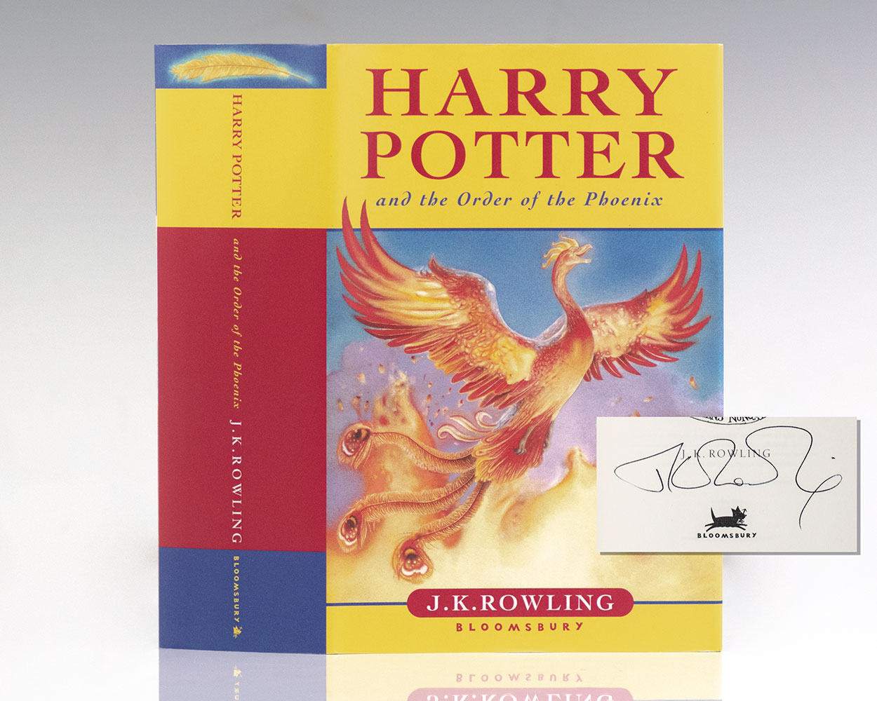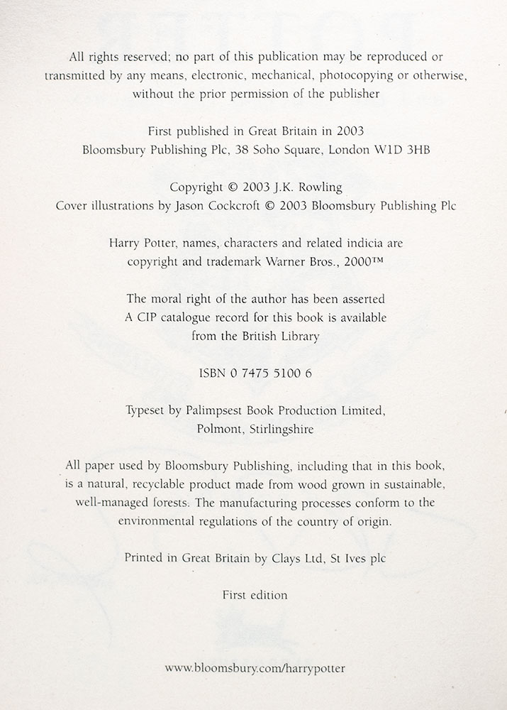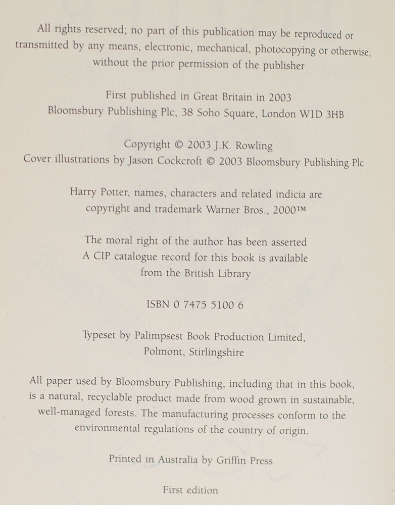 First edition of the fifth novel in J.K. Rowling's Harry Potter Series. Octavo, original illustrated boards. Boldly signed by J.K. Rowling on the title page. With the author's hologram opposite the title page. Fine in a fine dust jacket. Jacket design by Jason Cockcroft.