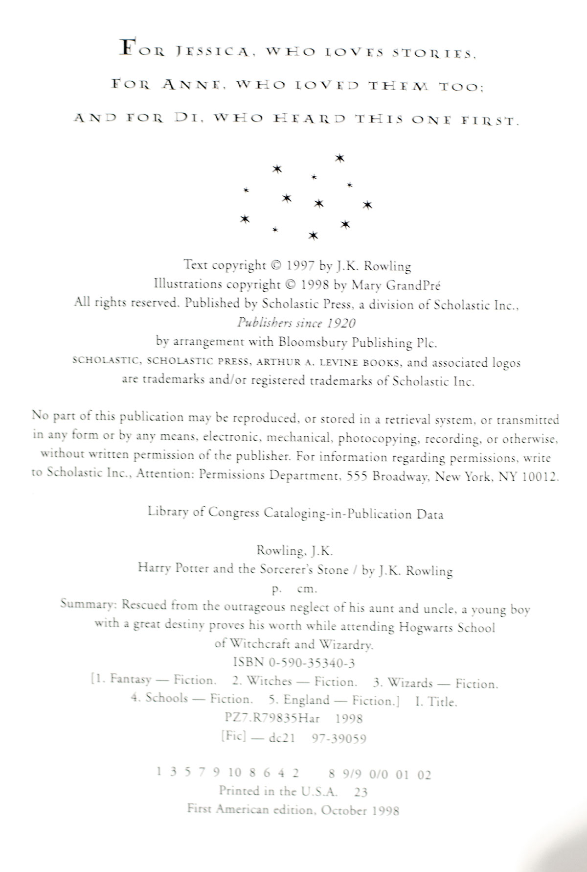 “It does not do to dwell on dreams and forget to live": First Edition of Harry Potter and the Sorcerer's Stone; Signed by J.K. Rowling and twice by Illustrator Mary Grandpre