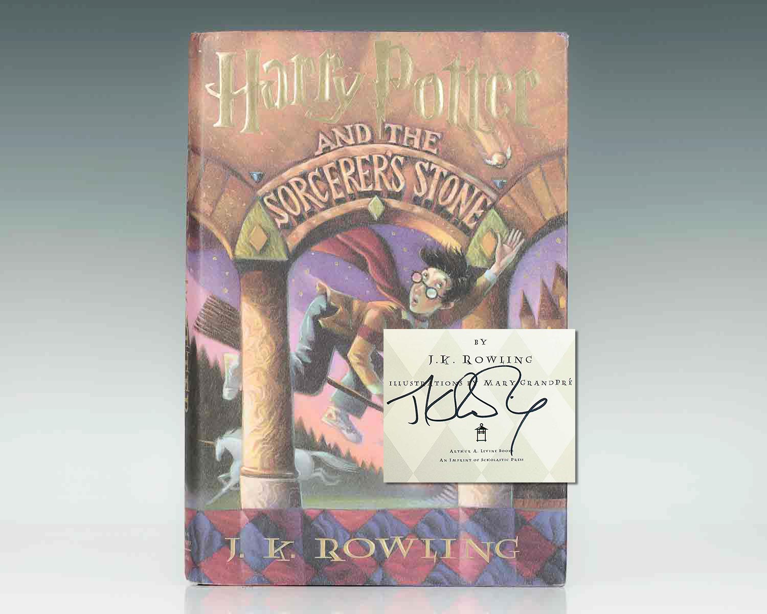 First American edition, later printing of the first book in the Harry Potter series. Octavo, original half cloth, illustrated by Mary Grandpre. Boldly signed by J.K. Rowling on the title page. Fine in a near fine dust jacket with light shelfwear.