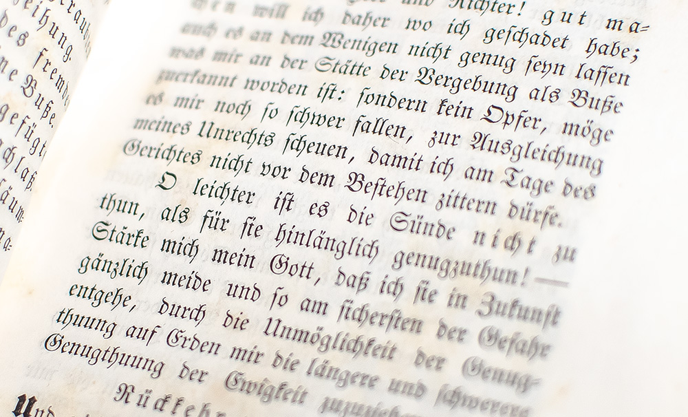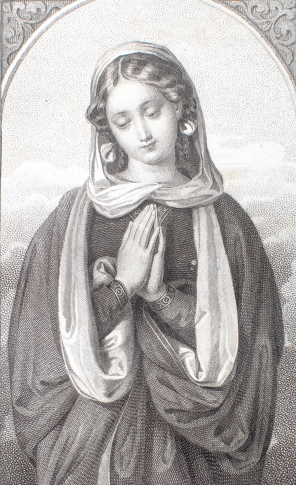 Rare 19th century Catholic prayer book in the German language. Octodecimo, bound in leather with stylized botanical designs stamped in blind to the spine, front and rear panels, metallic crucifixion of Jesus to the front panel, original metallic locking mechanism preserved, all edges gilt, tissue-guarded frontispiece of Mary with the cross, illustrated with six steel plates. In very good condition with light rubbing to the extremities, an ownership signature to the front flyleaf, and some toning throughout.