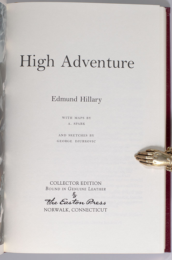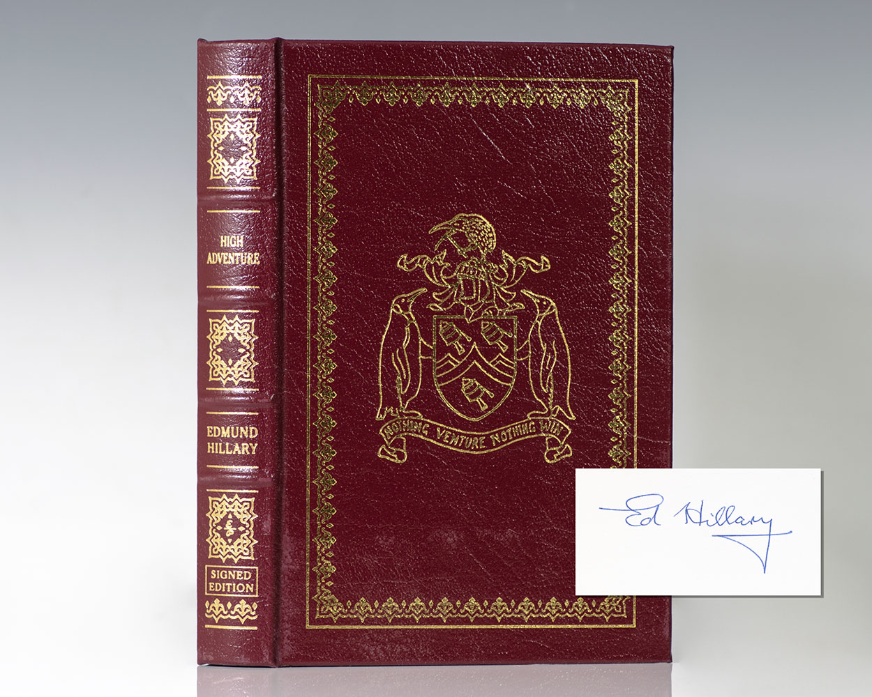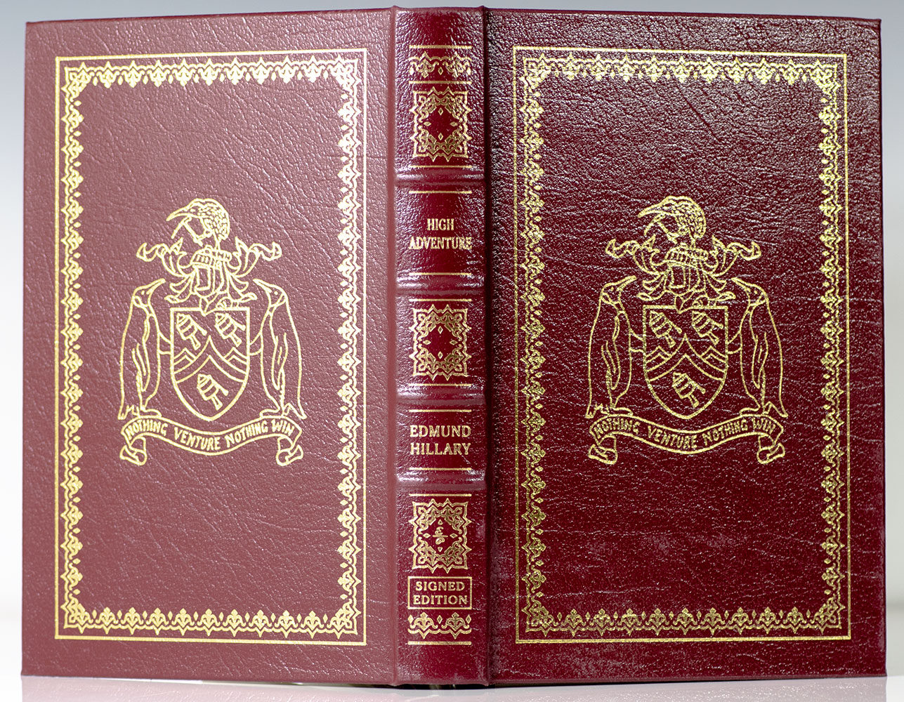 Signed limited first edition of this autobiography by the first person to summit Mount Everest. Octavo, bound in full leather, gilt titles and tooling to the spine, raised bands, gilt tooling to the front and rear boards, all edges gilt, silk endpapers, ribbon bound in, illustrated. Signed by Edmund Hillary. In fine condition. With maps by A. Sparks and sketches by George Djurkouic.