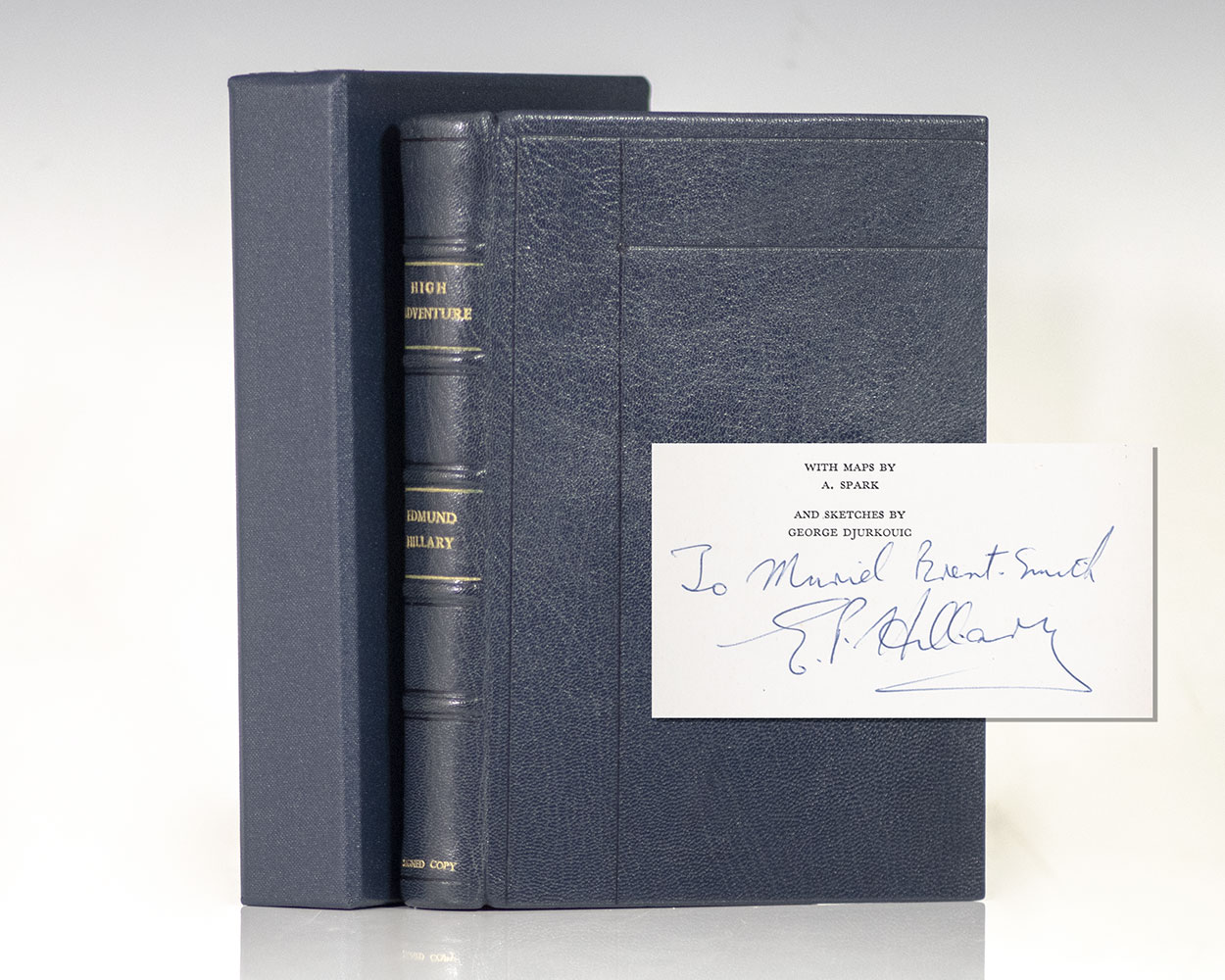 First British edition of Hillary's account of his ascent of Everest. Octavo, bound in full morocco, marbled endpapers, slipcase, with maps by A. Sparks and sketches by George Djurkouic. Presentation copy, inscribed by the author on the title page in a contemporary hand, "To Muriel Brent-Smith E.P. Hillary." In fine condition.
