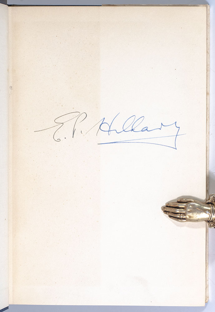 First British edition of Hillary's account of his ascent of Everest. Octavo, original blue cloth, with maps by A. Sparks and sketches by George Djurkouic. Boldly signed by the author in a contemporary hand on the front free endpaper, "E.P. Hillary." Near fine in a very good dust jacket.